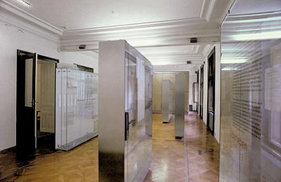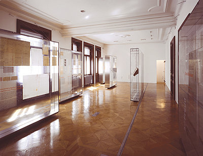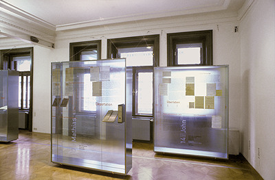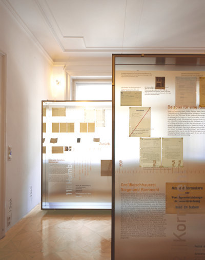 Die komplexe Anforderung der ausstellungsgerechten Verräumlichung von „Akten“ und Schriftdokumenten lösten die Architekten mit acht fragilen Stahl-Glas-Schaukästen, die aufgrund ihres dreischschichtigen Aufbaus eine hypertextartige Hierarchisierung des Datenmaterials erlaubte. Die vorderste Glasschicht diente der Kurzinformation und Einstieg in das jeweils einer Wohnung zugeordnete Thema. Die mittlere Ebene gab Raum für wissenschaftliche Kommentare, Originaldokumente befanden sich auf der hintersten Schicht. Diese diagrammatische Tiefenstruktur ermöglichte eine schnelle Lektüre ebenso wie vertiefendes Lesen durch alle Schichten hindurch.