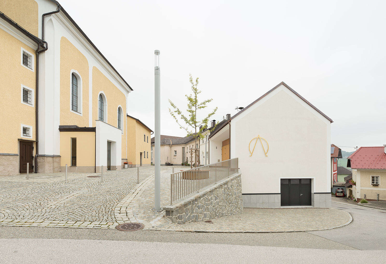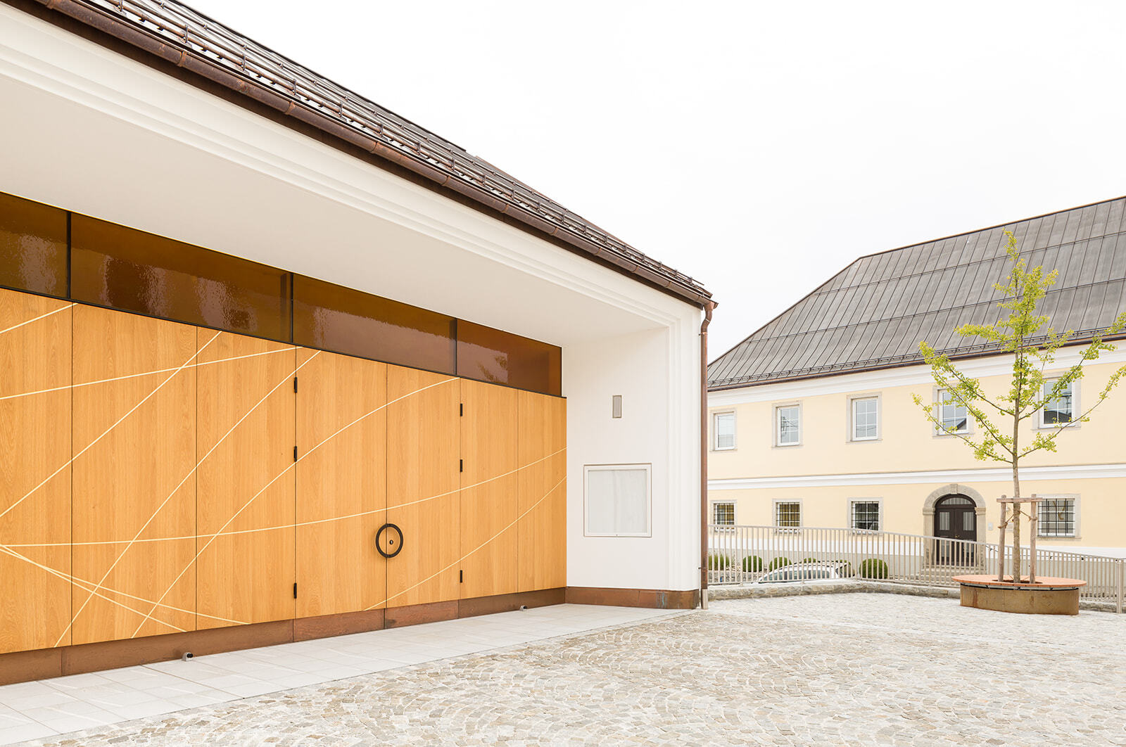 Für die Umgestaltung wurde das Untergeschoss als Sockel und dienende Struktur erhalten, darüber wurde ein für die Verabschiedung angemesser Raum geschaffen, der sich barrierefrei zum Platz hin öffnet und diesen erweitert. Die Giebel- und die Südwand des Hybridbaus wurden massiv ausgeführt. Damit fügt sich das Gebäude materialästhetisch ins Ortsbild und erhält die bauphysikalisch nötige Speichermasse. Die Nordfassade und der Dachstuhl wurden in Holzbauweise umgesetzt.