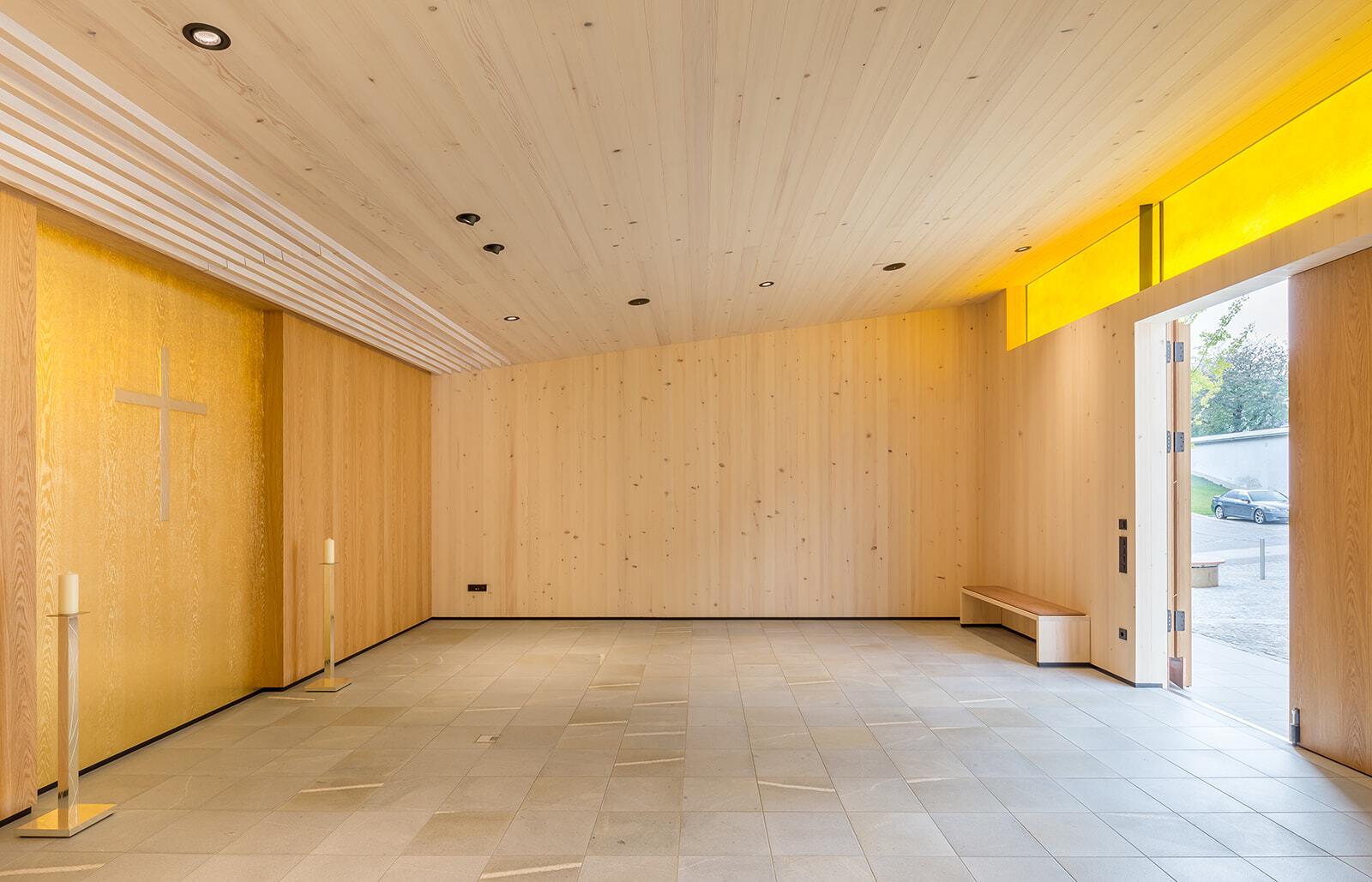 Die Fassade Richtung Platz, Kirche und Ortszentrum wurde in Zusammenarbeit mit Bruder Thomas (Europakloster Gut Aich) künstlerisch gestaltet. Feine, vergoldete Lebenslinien scheinen jeden noch so kleinen Lichtstrahl aufzunehmen und zu reflektieren, vermitteln Wärme und geben dem umgebenden Eichenholz besondere Wertigkeit. Der Innenraum wurde mit Weißtanne und Eiche ausgebaut, durch Oberlichten indirekt belichtet. Dass der Bestand in einen stimmungsvollen Ort der Trauer und Begegnung mitten im Ortskern verwandelt werden konnte, verdankt sich nicht zuletzt dem besonderen Engagement des Pfarrers und der unzähligen ehrenamtlichen Arbeitsstunden der Pfarrmitglieder. (Text: Architekt, bearbeitet)