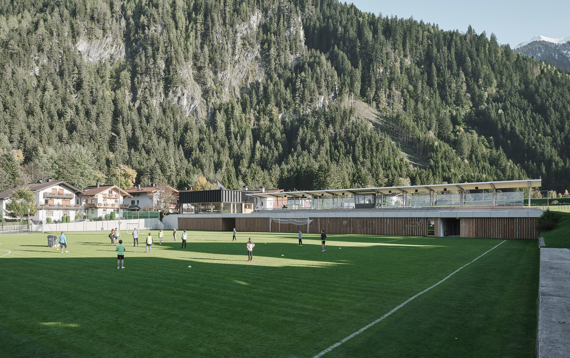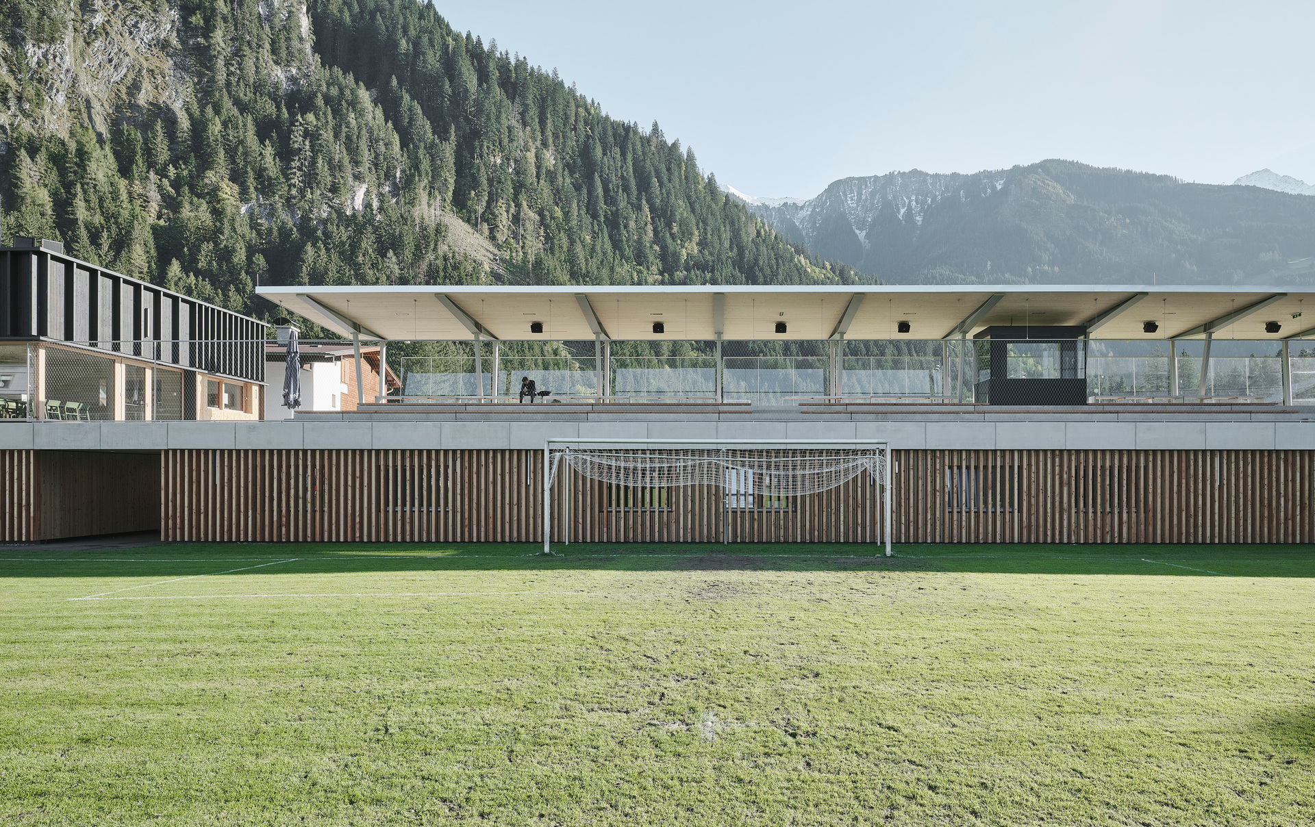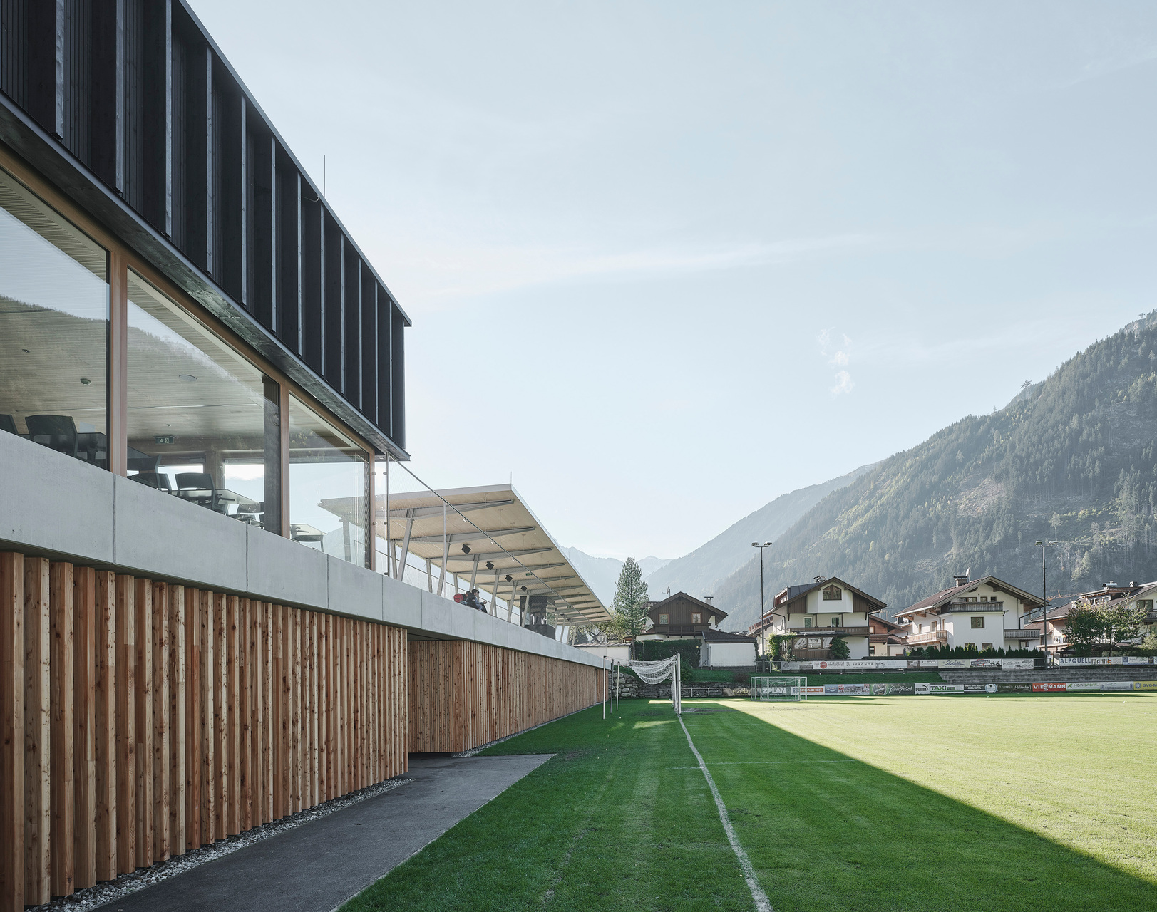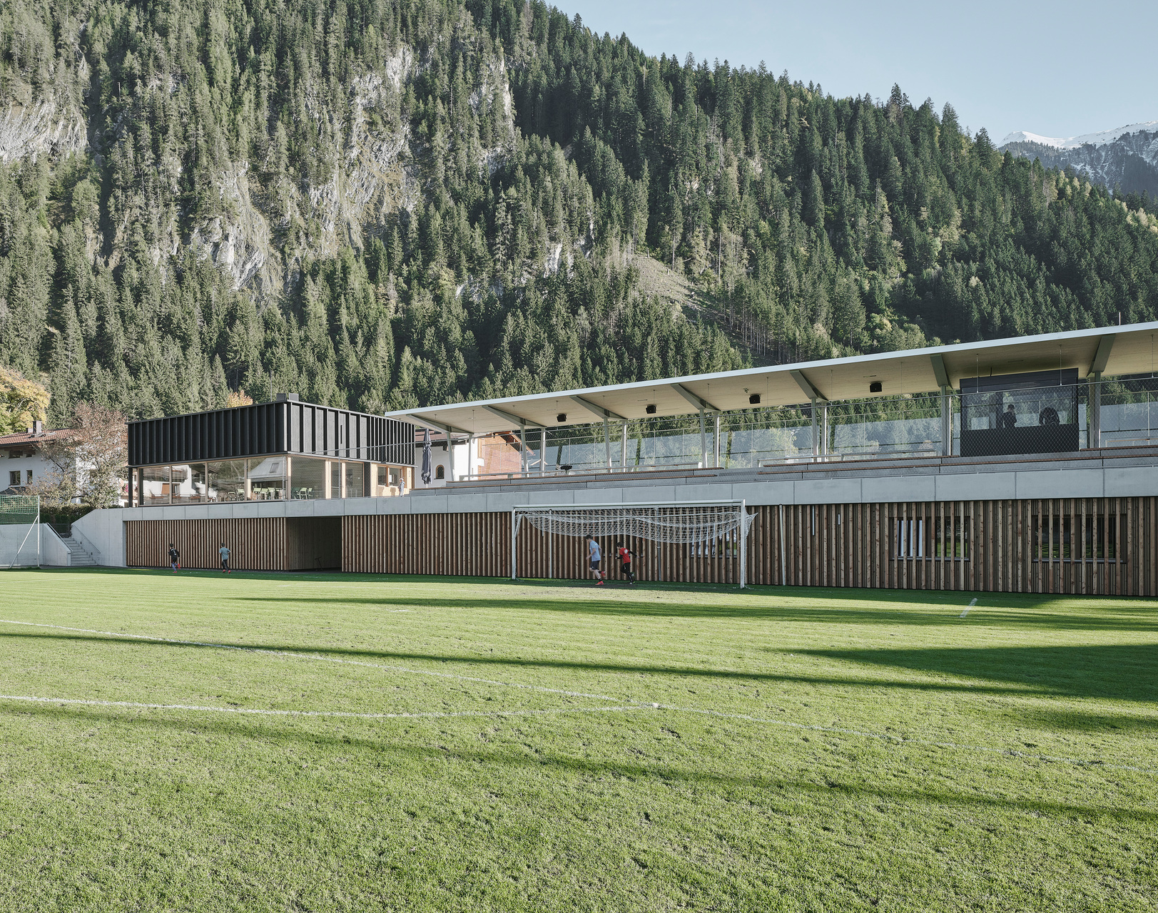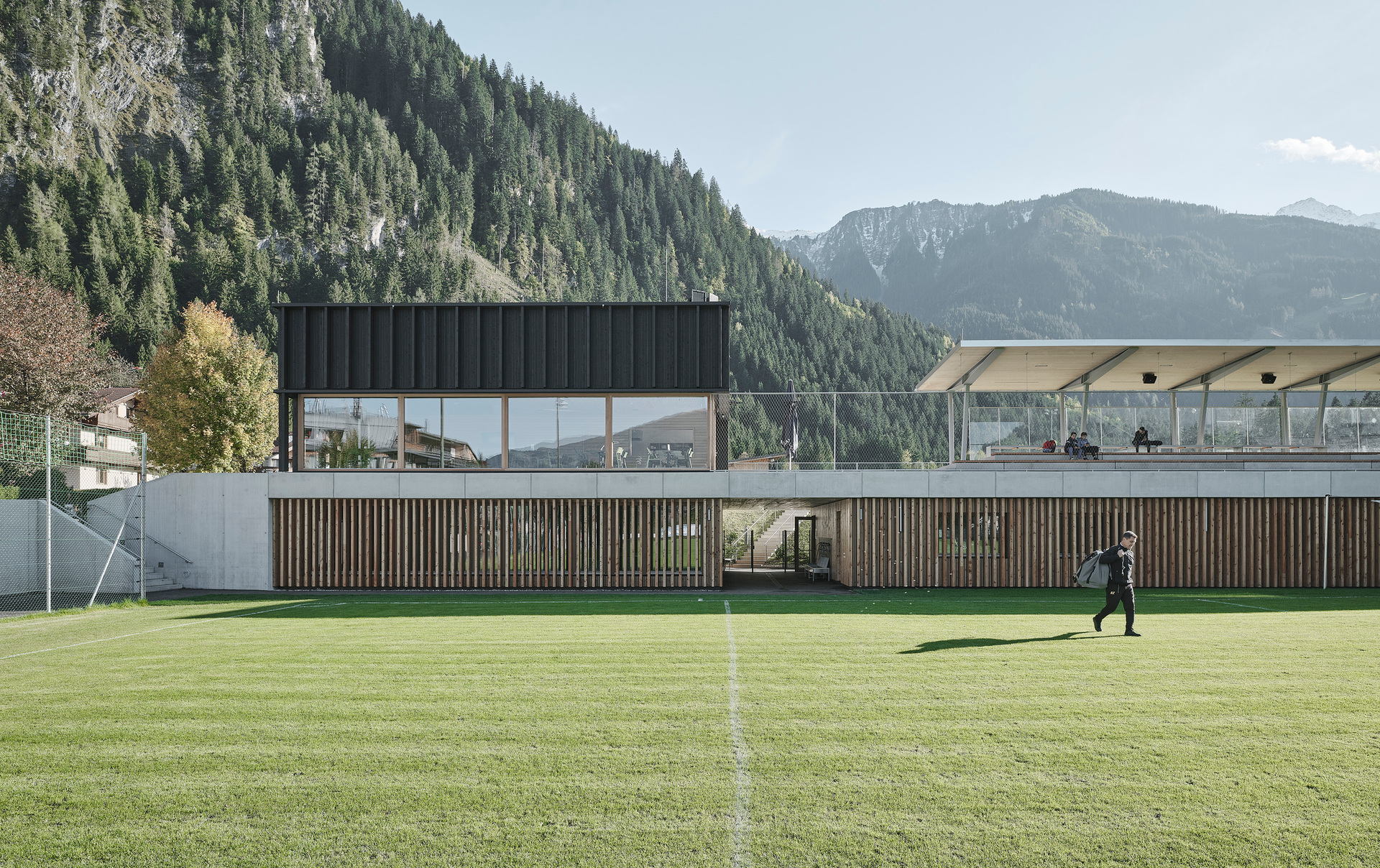 Der flache Garderobentrakt des Fußballklubs bildet als Rückwand die südliche Begrenzung des Spielfelds, ist zur Nordseite hin weitgehend eingegraben und tritt nur vom Platz aus in Erscheinung. Darüber liegt die Zuschauer:innentribüne, die von einem Flugdach überspannt wird. An der Ostseite wurde auf den niedrigen Sockelbau ein relativ kleines, zweigeschossiges Volumen gesetzt, das den Vereinsraum und die Kantine aufnimmt. An der Straße bewusst sichtbar platziert, übernimmt es die adressbildende Funktion des Gebäudes.