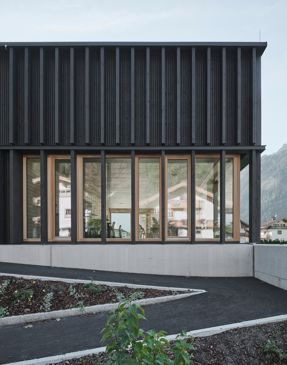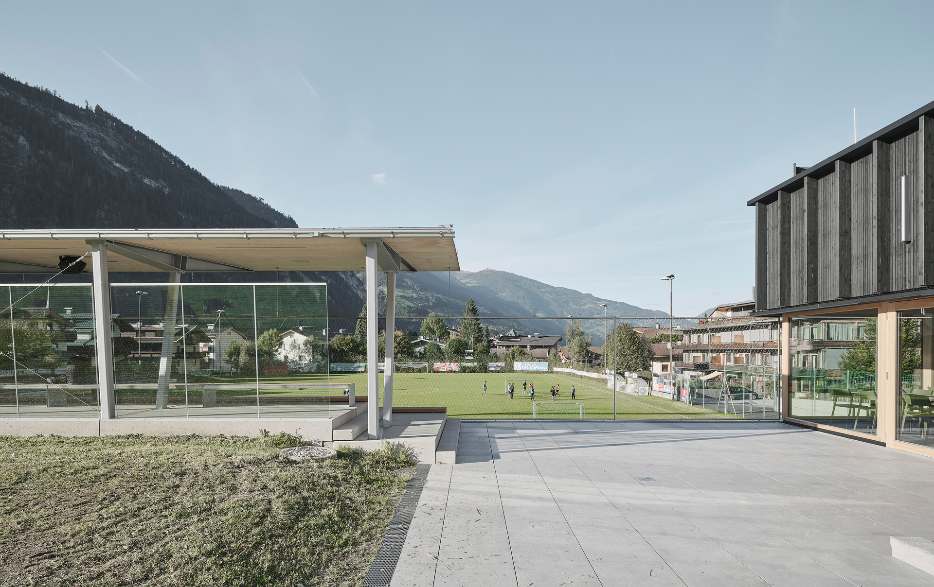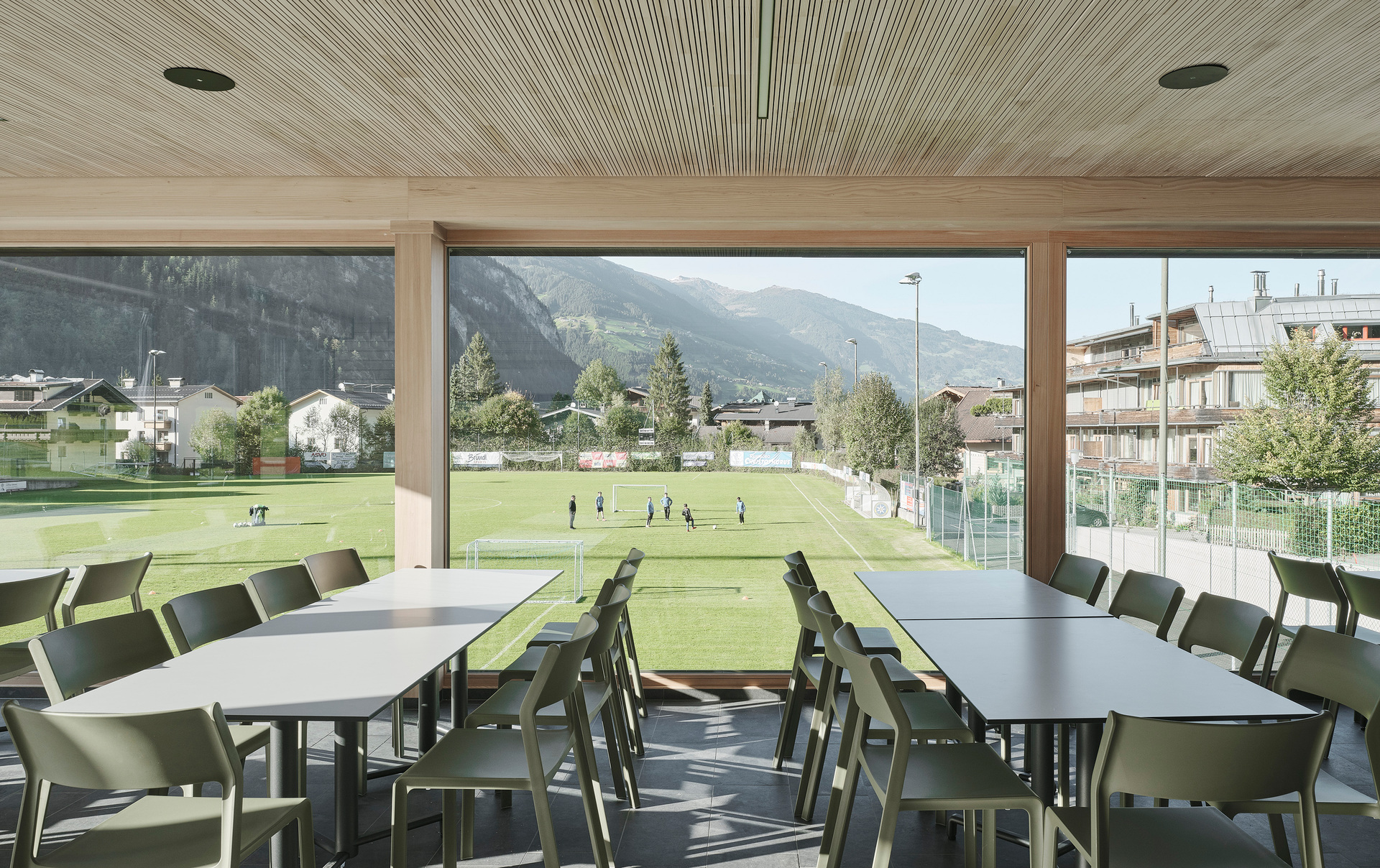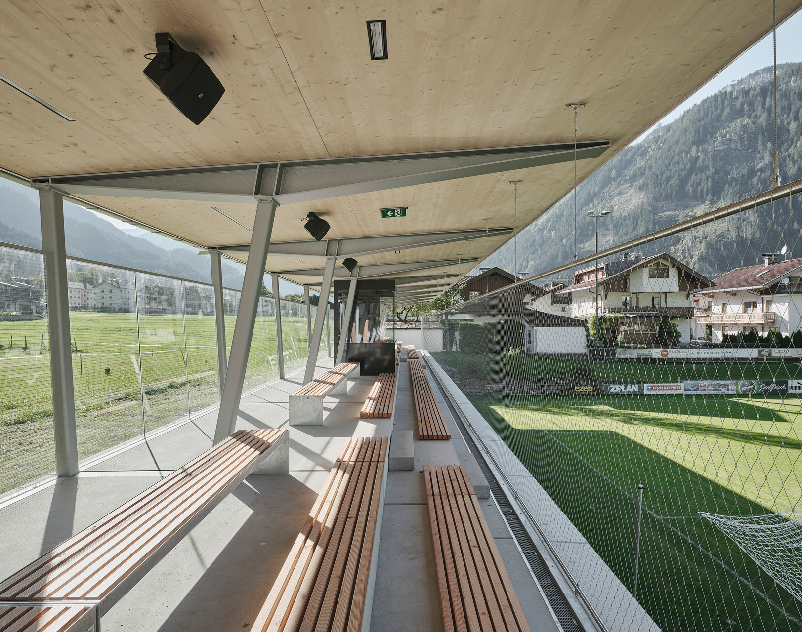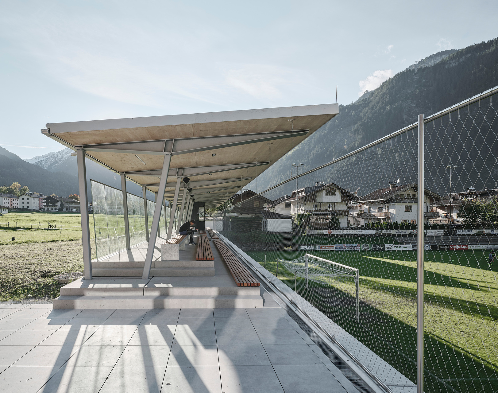 Der flache Garderobentrakt des Fußballklubs bildet als Rückwand die südliche Begrenzung des Spielfelds, ist zur Nordseite hin weitgehend eingegraben und tritt nur vom Platz aus in Erscheinung. Darüber liegt die Zuschauer:innentribüne, die von einem Flugdach überspannt wird. An der Ostseite wurde auf den niedrigen Sockelbau ein relativ kleines, zweigeschossiges Volumen gesetzt, das den Vereinsraum und die Kantine aufnimmt. An der Straße bewusst sichtbar platziert, übernimmt es die adressbildende Funktion des Gebäudes.