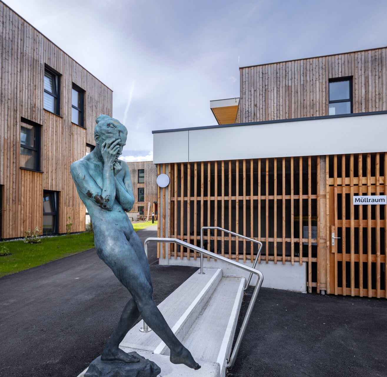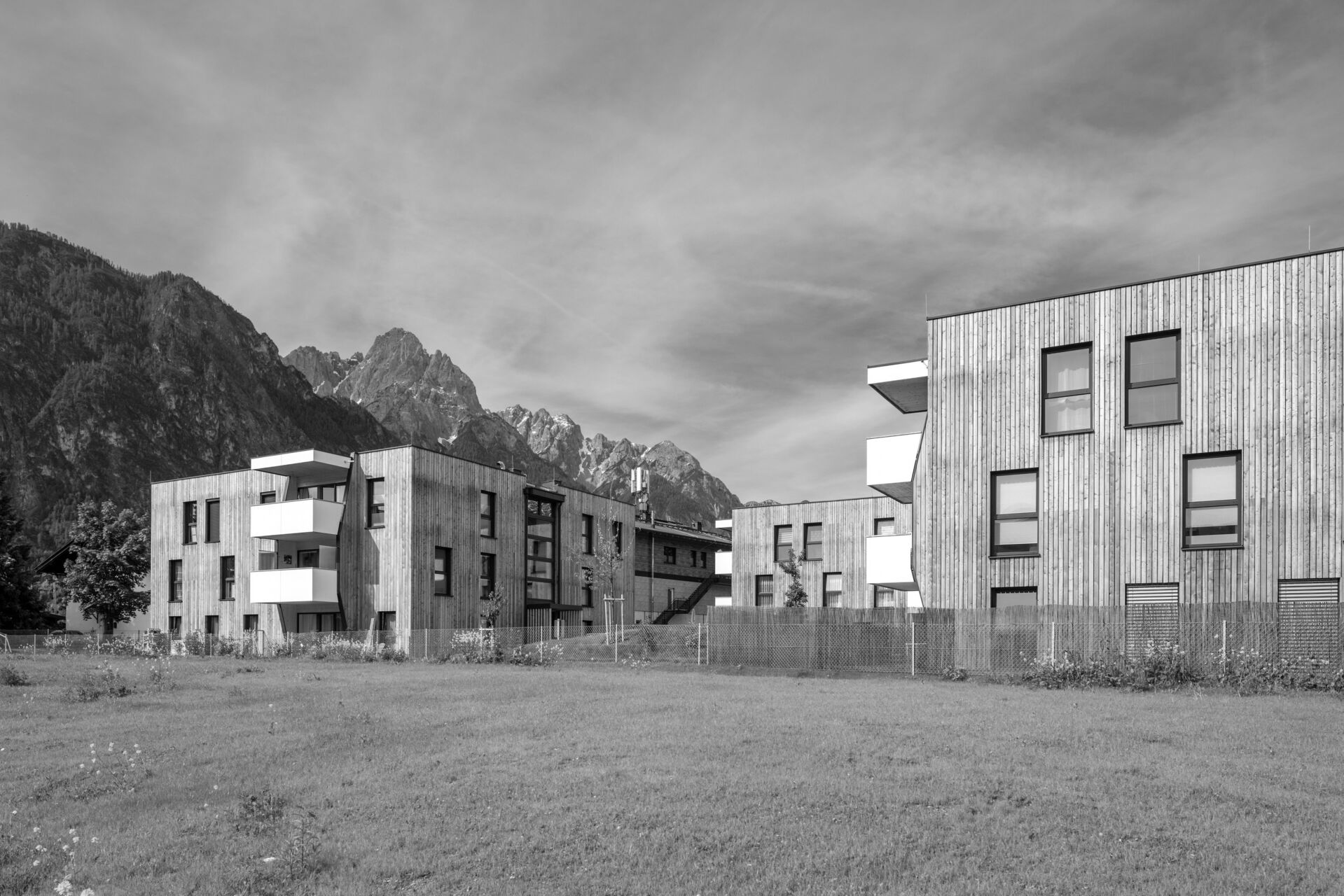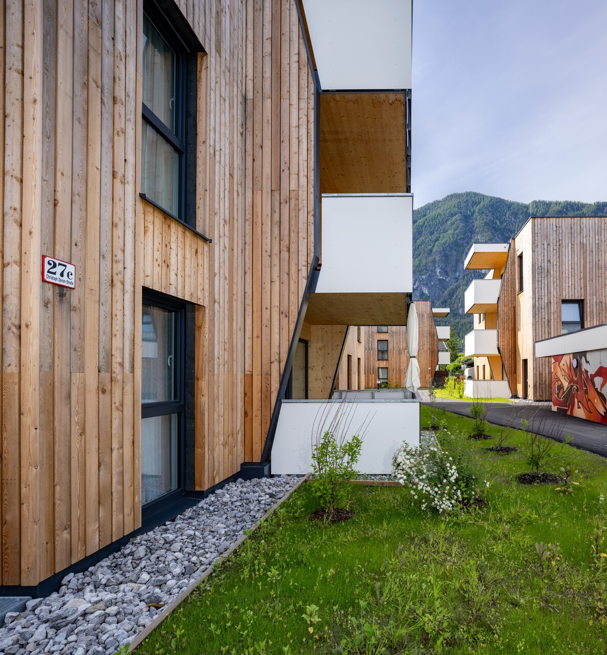 Errichtet wurde die Wohnanlage – als einzige in Lienz Süd – in Holzfertigteilbauweise über einem massiven Untergeschoß mit Tiefgarage und Kellerräumen, das die drei Häuser unterirdisch verbindet. Die Außenwände bestehen aus vorgefertigten Riegelwandelementen mit einer Verschalung aus sägerauer, unbehandelter Lärche. Weiße Plattenverkleidungen an Balkonen und Vordächern setzen einen farblichen Kontrast zur bewusst vergrauenden Holzfassade. Jeweils im Norden liegt ein großzügig belichtetes Stiegenhaus, das ebenso wie die Geschoßdecken in Brettsperrholz ausgeführt ist. Den oberen Abschluss bilden begrünte Flachdächer.