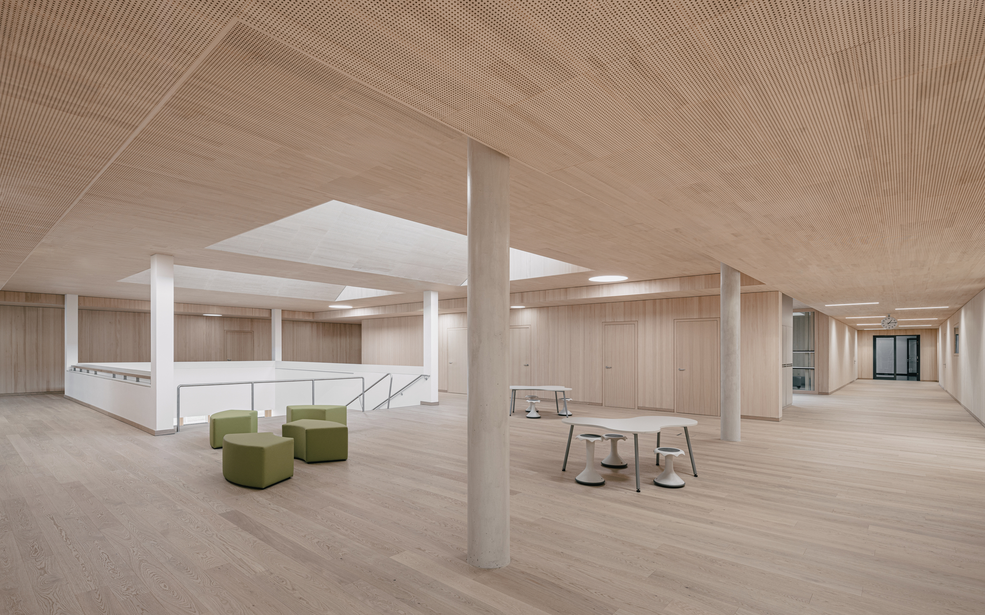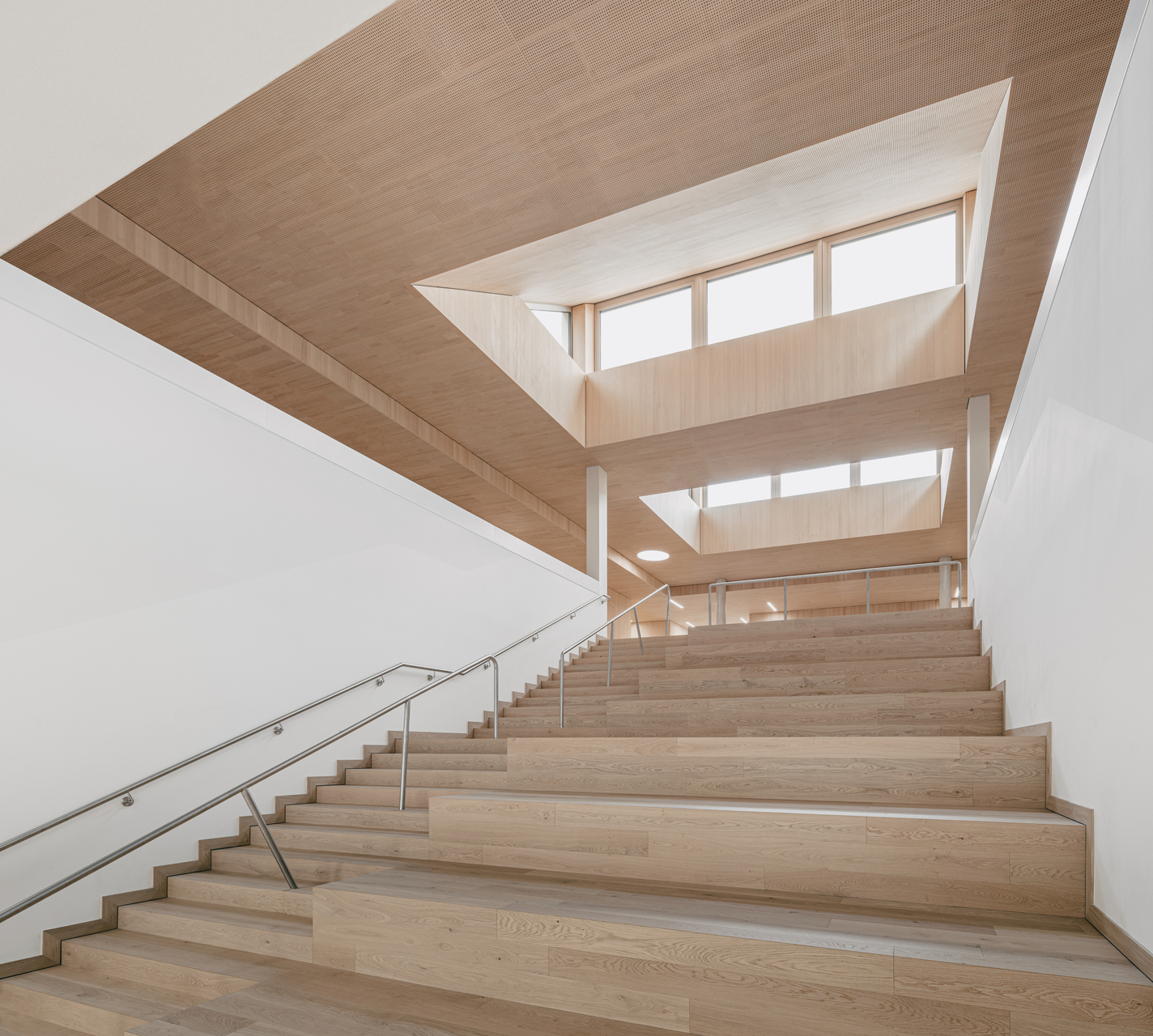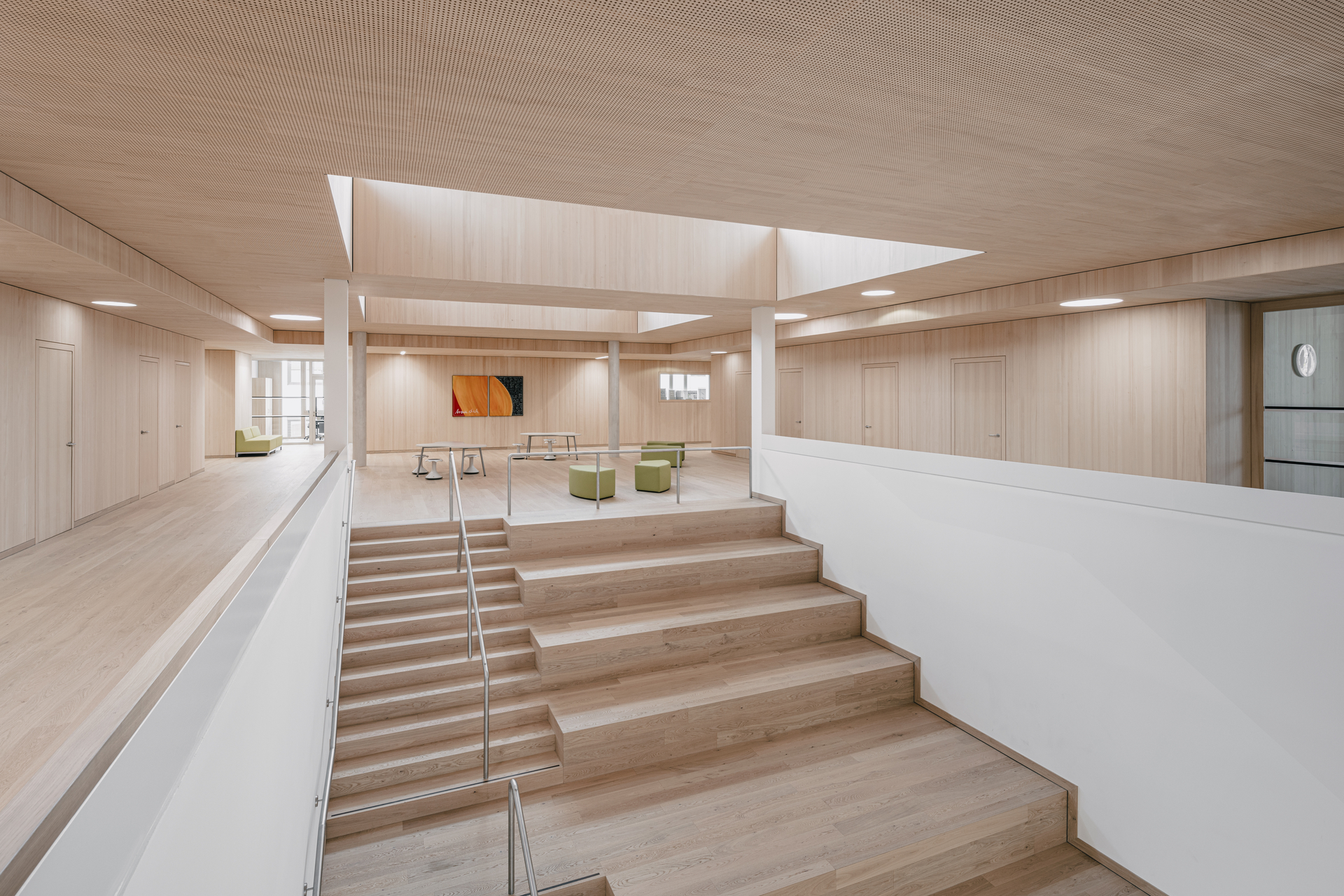 Ein wesentliches räumliches Element ist die offene Treppenlandschaft mit integrierten Sitzstufen im Neubau. Sie verbindet die Geschosse und wird gleichermaßen als Aufenthaltsraum genutzt. Über nordostorientierte Shed-Oberlichter im Dach gelangt diffuses Tageslicht ins Gebäude und schafft strukturierte Raumzonen mit differenzierten Aufenthaltsqualitäten.