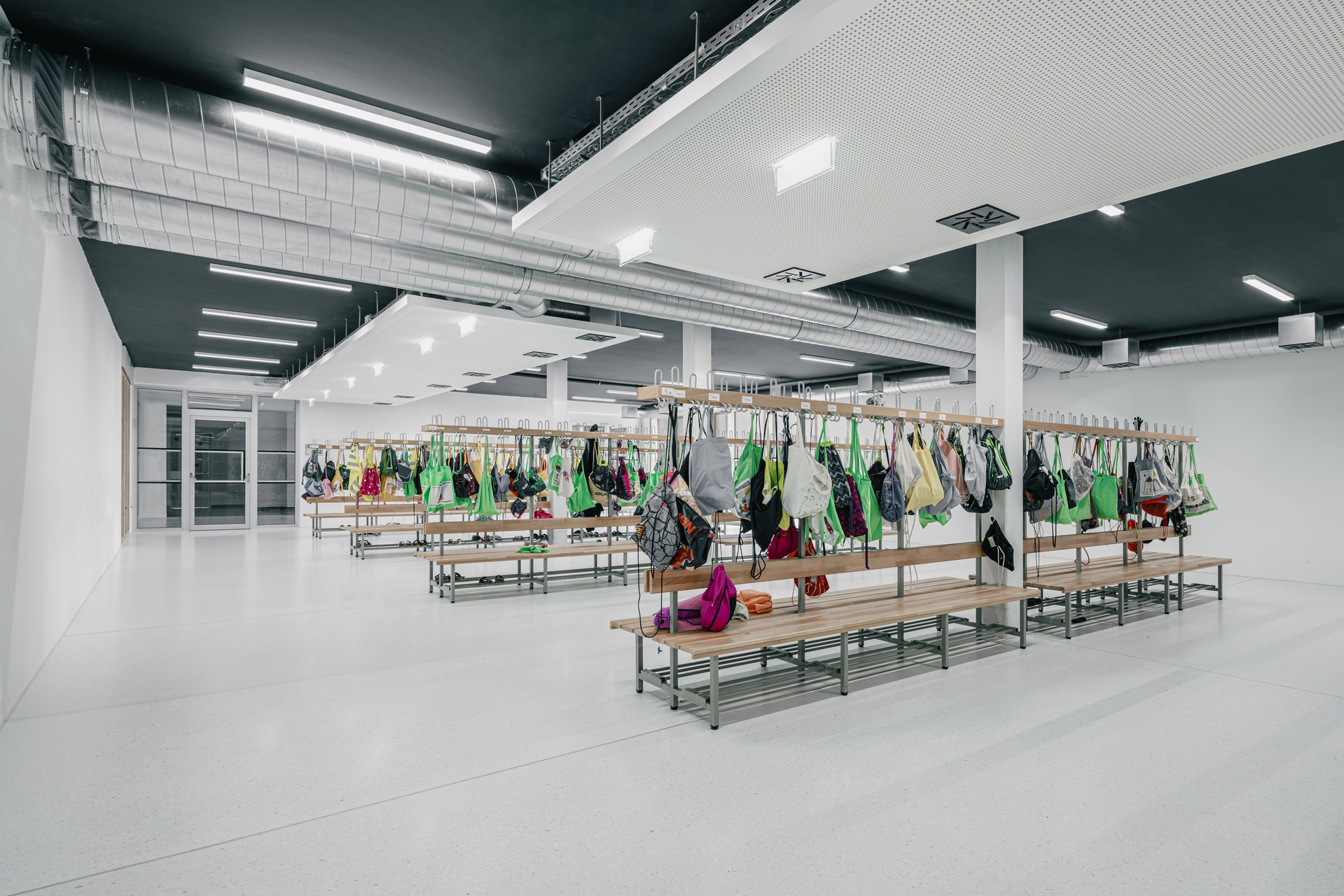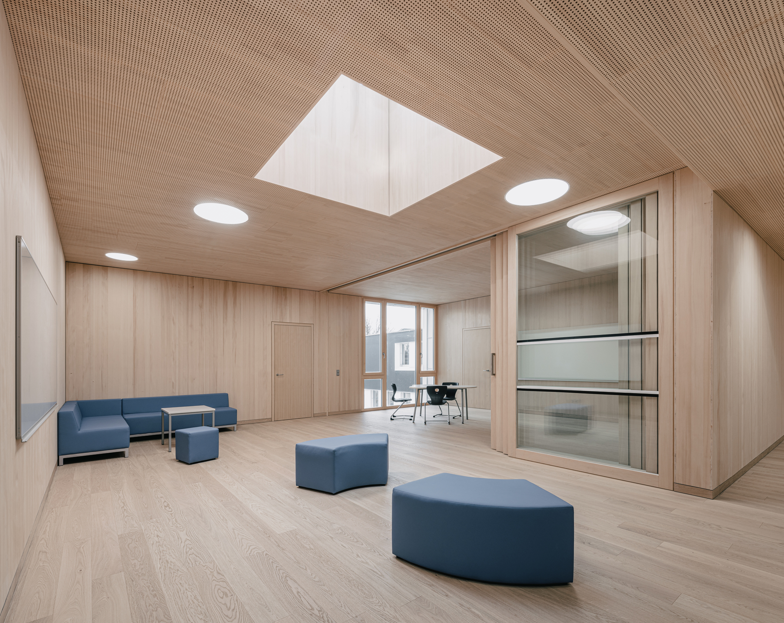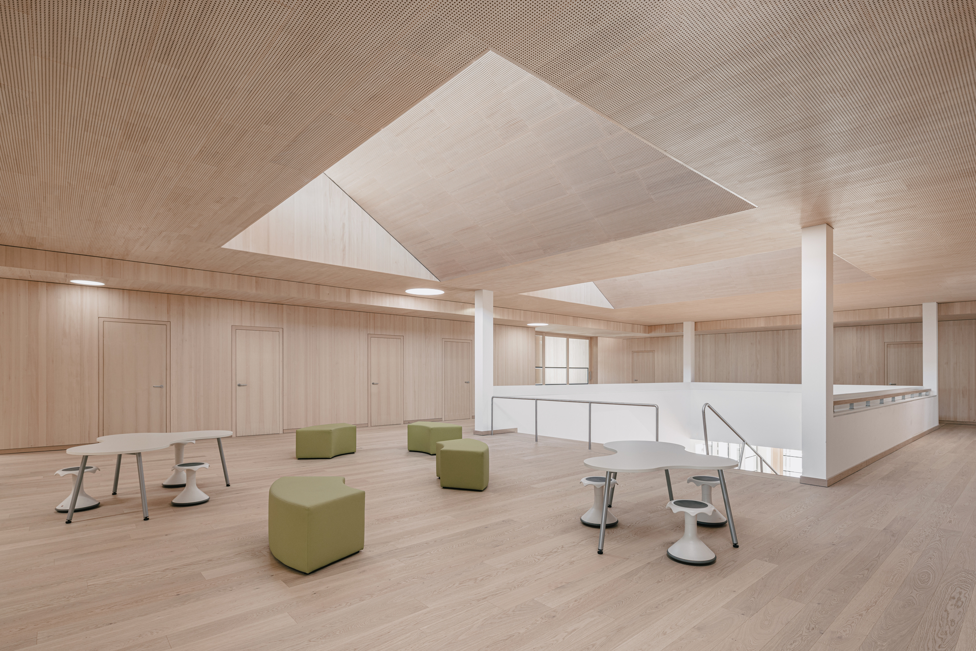 Ein wesentliches räumliches Element ist die offene Treppenlandschaft mit integrierten Sitzstufen im Neubau. Sie verbindet die Geschosse und wird gleichermaßen als Aufenthaltsraum genutzt. Über nordostorientierte Shed-Oberlichter im Dach gelangt diffuses Tageslicht ins Gebäude und schafft strukturierte Raumzonen mit differenzierten Aufenthaltsqualitäten.