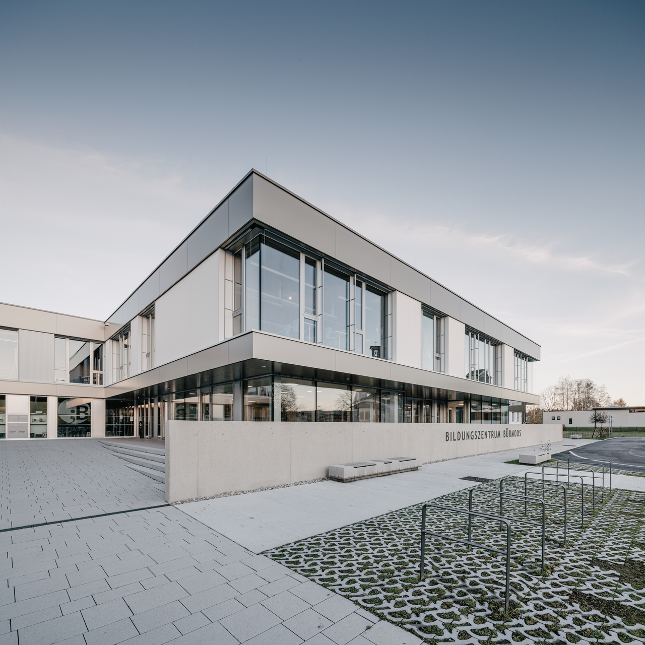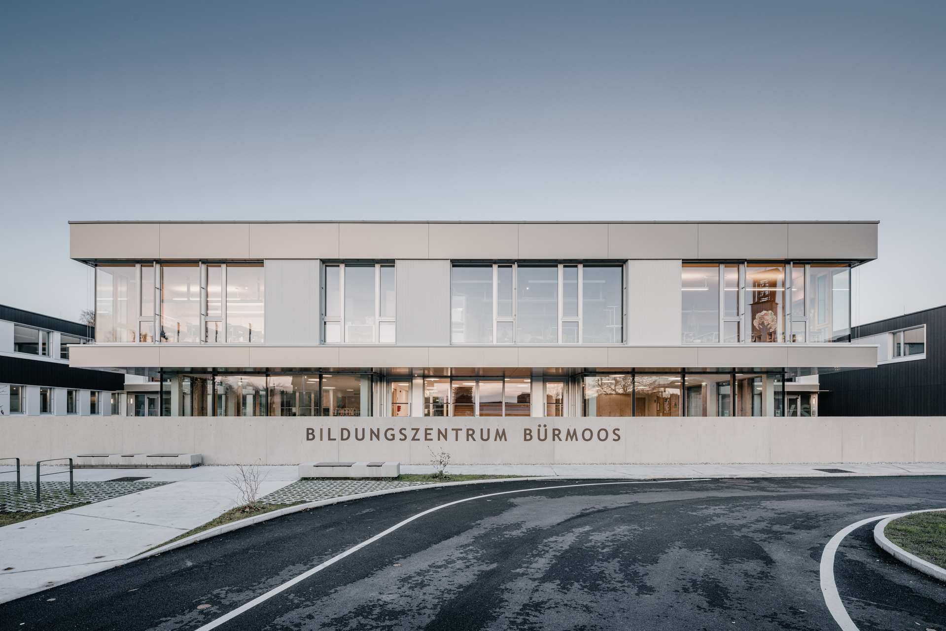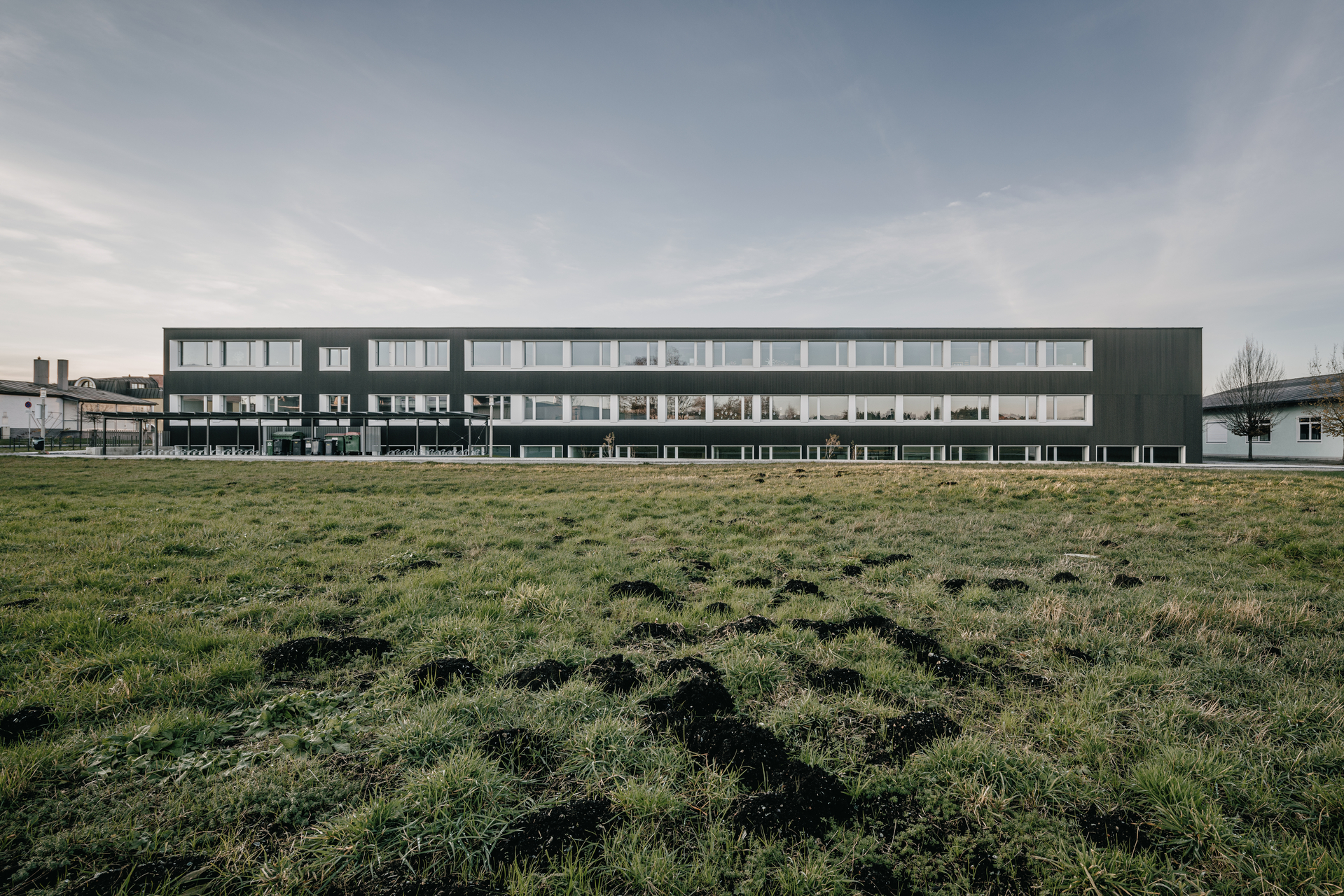 Auch in den Bestandsbauten wurden punktuelle Aufweitungen vorgenommen, um offenes Lernen in den schlanken Baukörpern zu ermöglichen. Darüber hinaus erfolgten eine umfassende brandschutztechnische und thermische Sanierung sowie einer gestalterischen Aufwertung der Fassaden mit vorgehängten, beschichteten Aluminiumplatten. Diese fast schwarzen Paneele erinnern in Form und Farbe an die Torfziegel, die in Bürmoos einst aus dem Moor gestochen wurden. Die noch vorhandenen Reste des Moores sind heute geschützt und schon vor vielen Jahren hat sich Bürmoos zur (T)Dorferneuerung bekannt. (Text: Initiative Architektur)