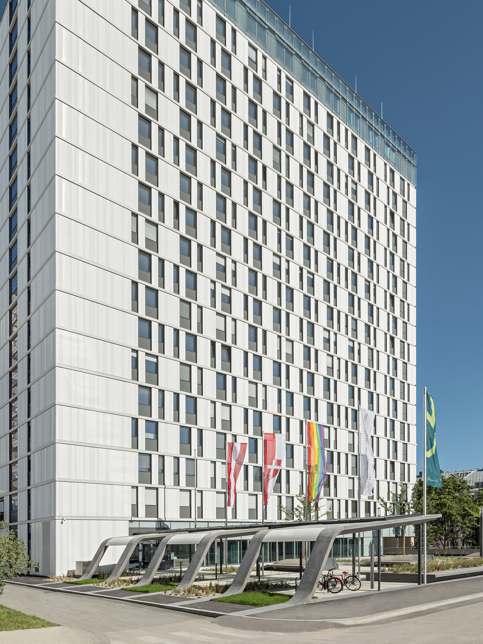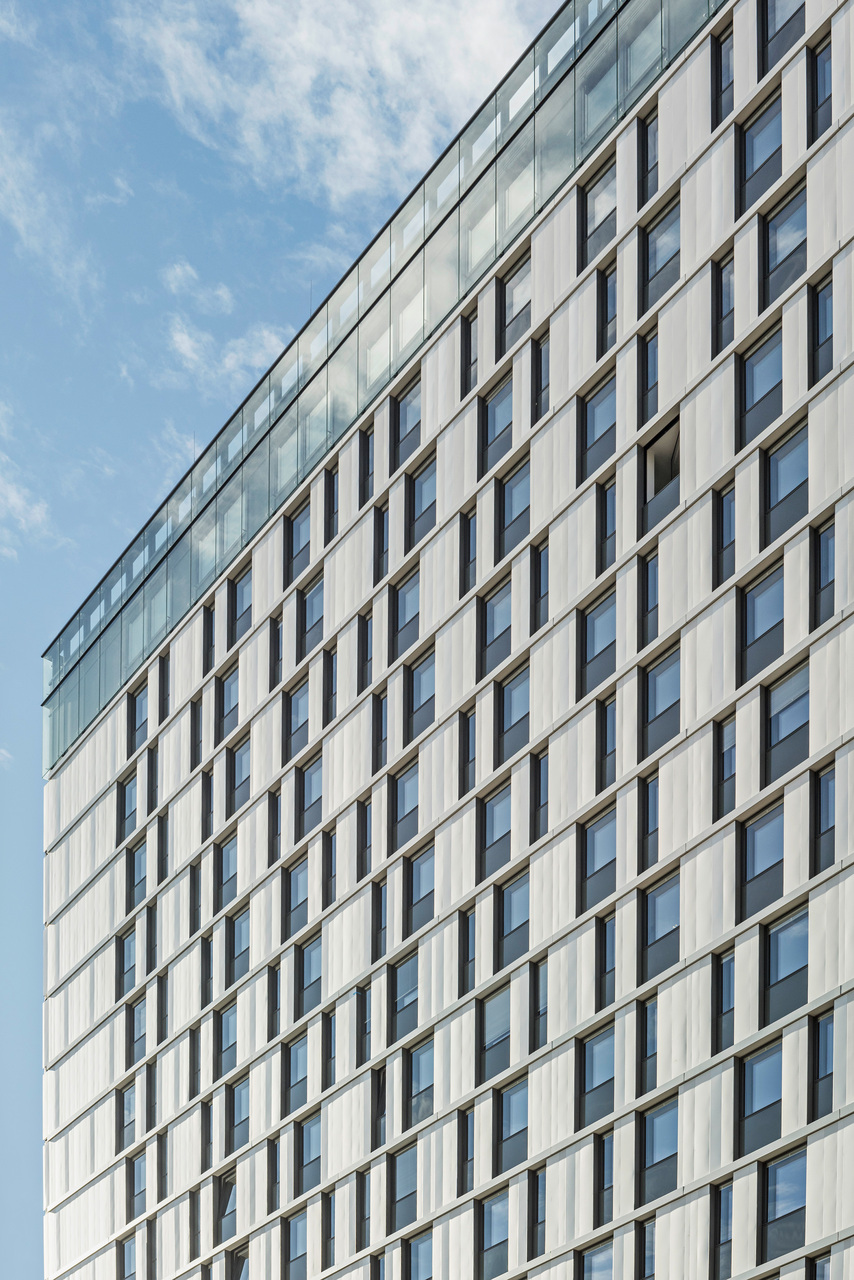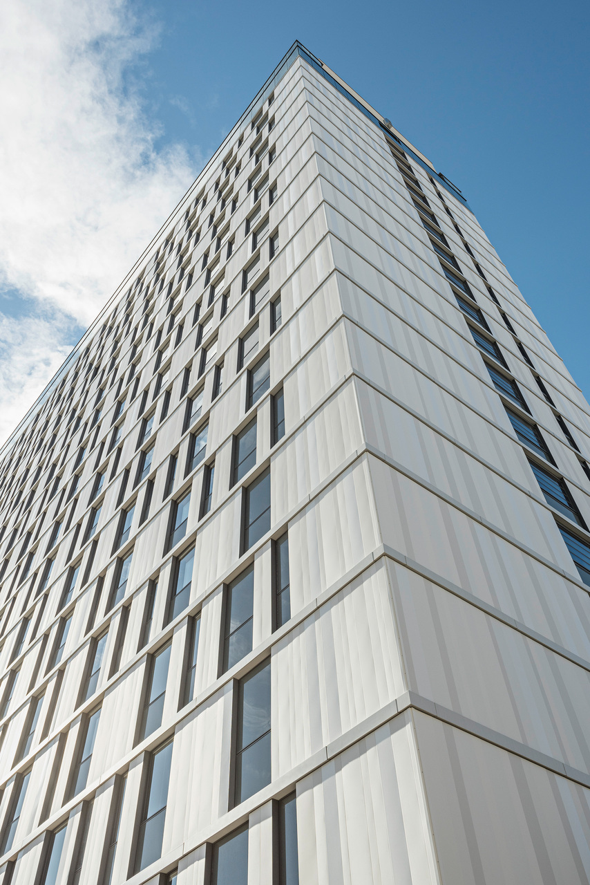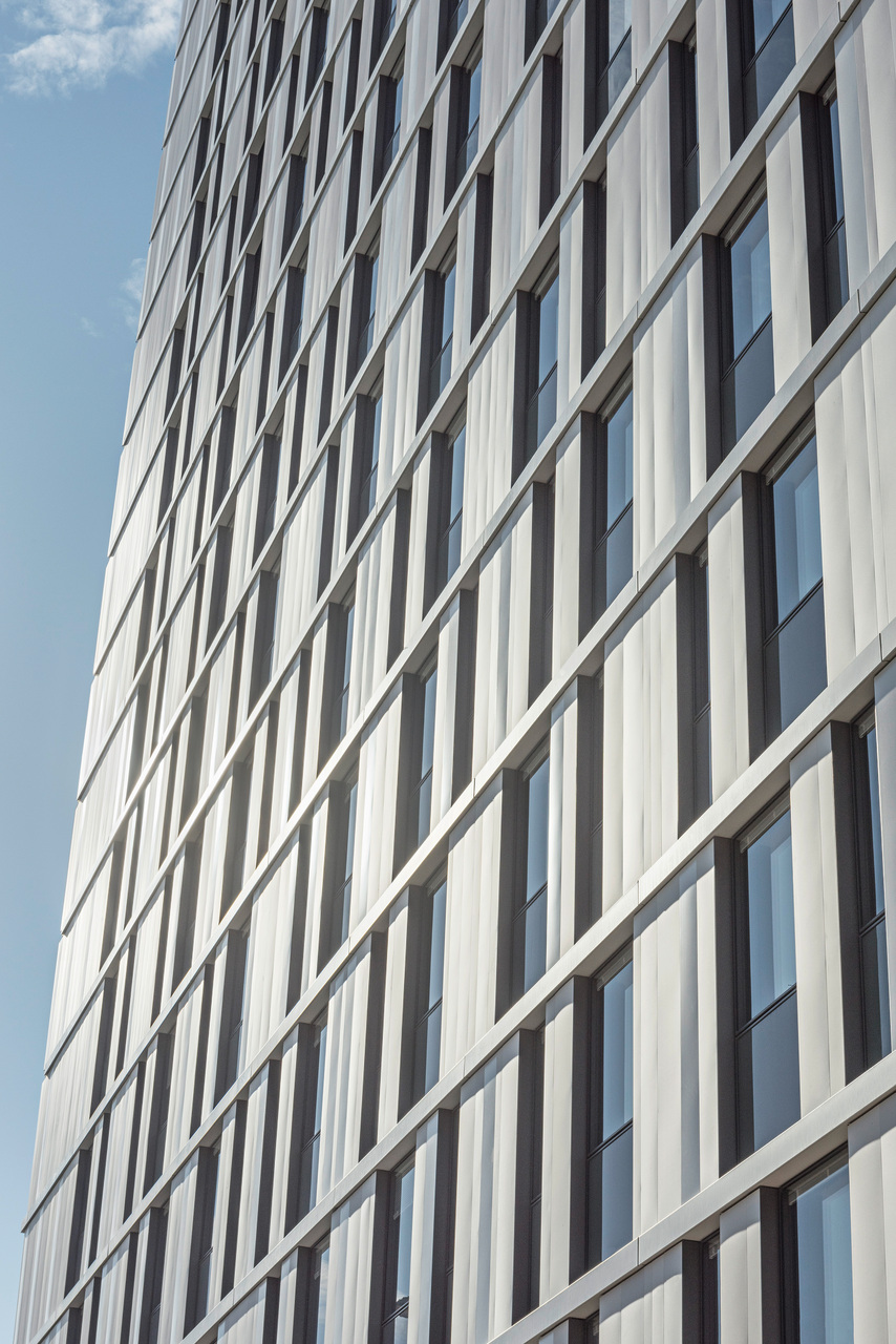 Die opaken Elemente der thermisch optimierte Fassade aus unterschiedlich breiten Aluminiumpaneelen sind frei positioniert. Die hochreflektierenden Oberflächen erzeugen mit verschiedenen leicht changierenden Weißtönen den Barcode-Effekt der Fassade, welcher dem Bürogebäude den Namen gab. Horizontale Bänder gliedern die Vertikale. Die transparenten Elemente sind als Verbundfensterkonstruktionen ausgeführt, was die Reinigung der Scheiben und die Wartung des Sonnenschutzes von innen ermöglicht – Fassadenbefahranlagen sind nicht nötig.