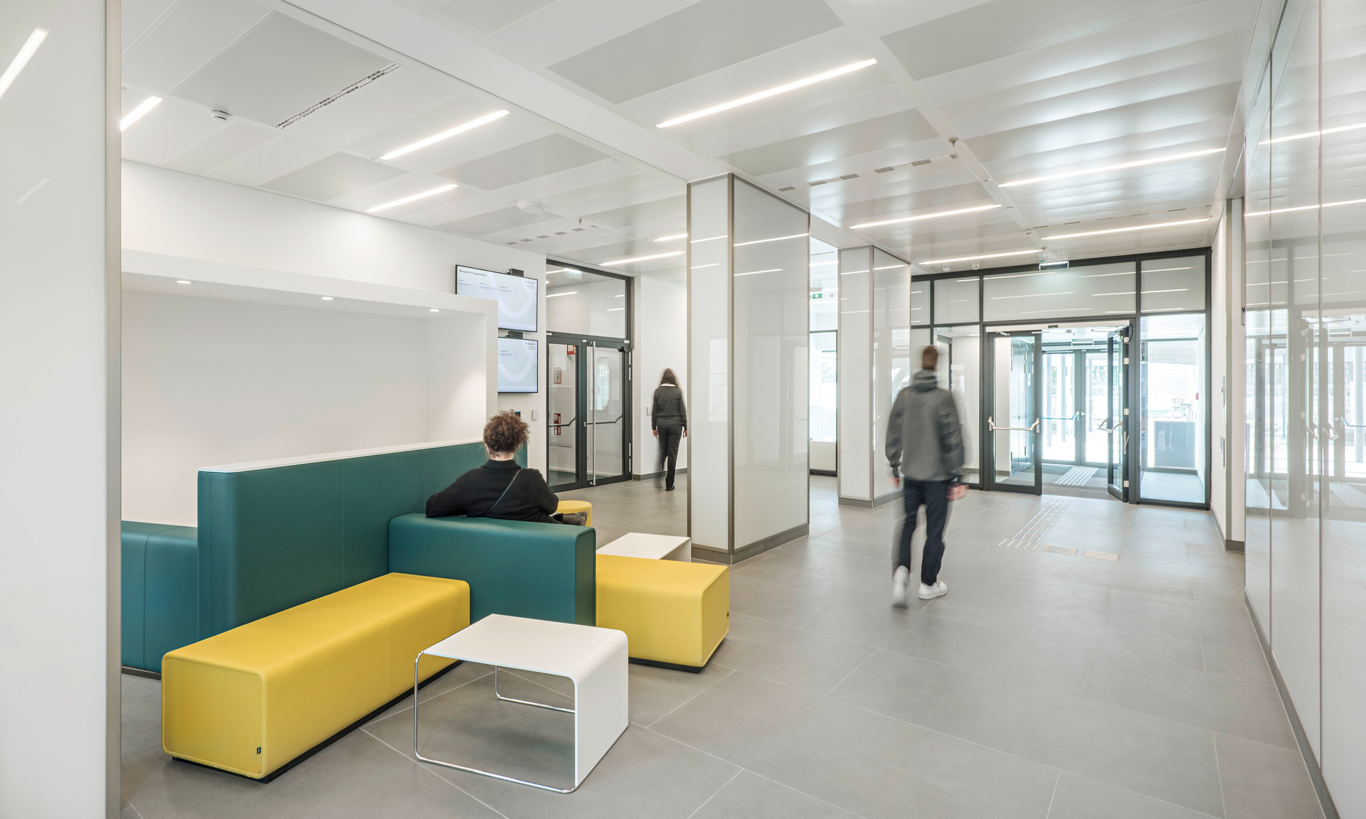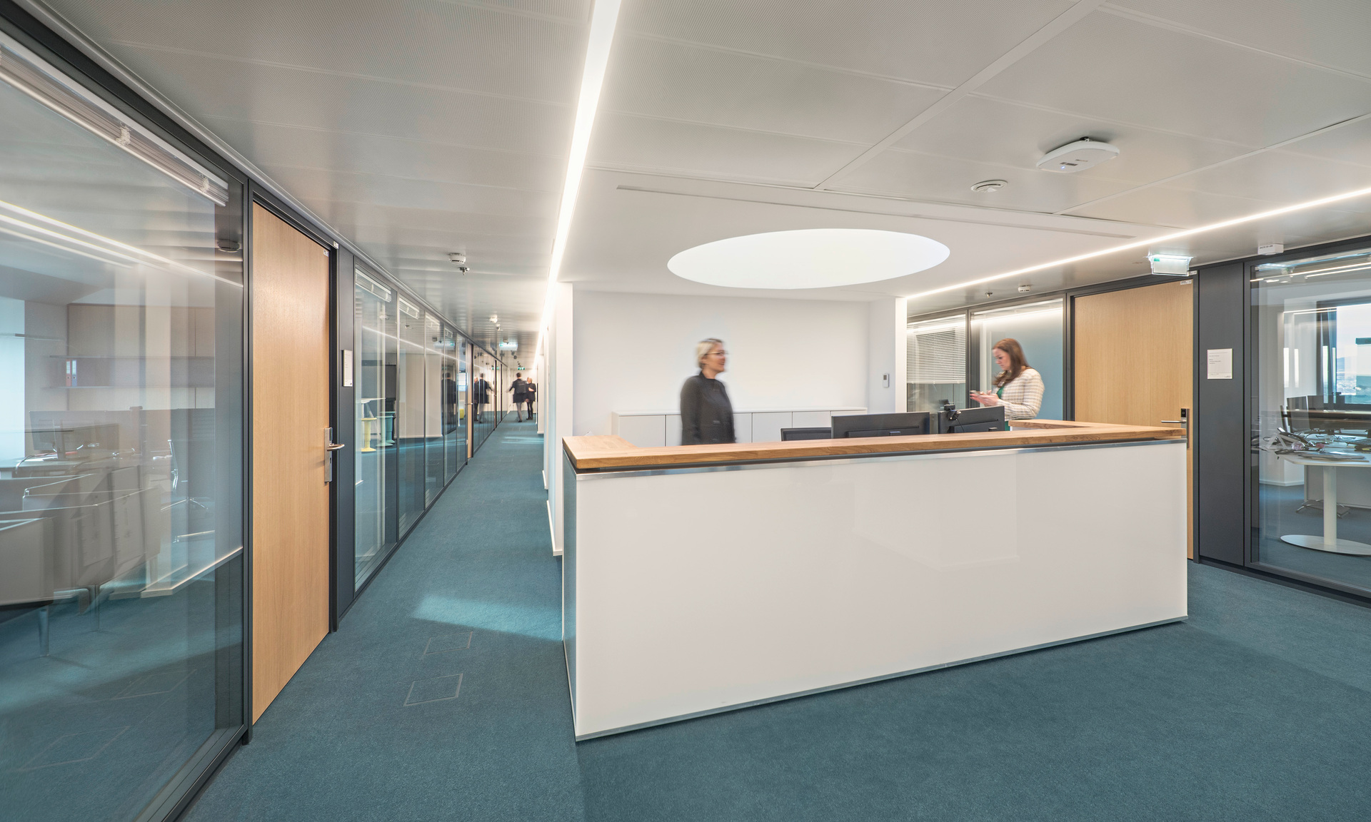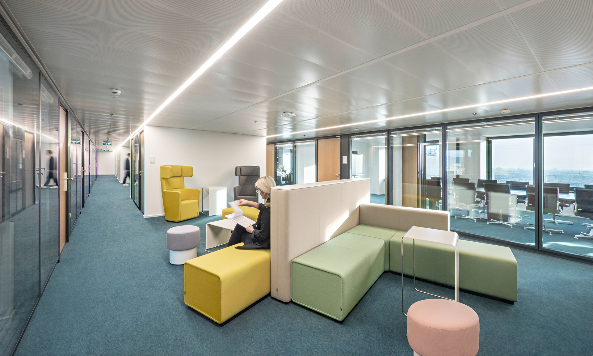 Die Open Spaces der Büroetagen bieten vielseitige Settings für Meetings, alternative Arbeitsbereiche und Relax-Zonen. Verglaste Systemwände unterstützen den größtmöglichen Lichteinfall und sorgen für Transparenz. Die Farben der Corporate Identity des Wiener Gesundheitsverbundes – Petrol, Grün, Mint, Blaugrau – und die Materialien Holz, Metall und Glas erzeugen eine elegant-angenehme Atmosphäre.