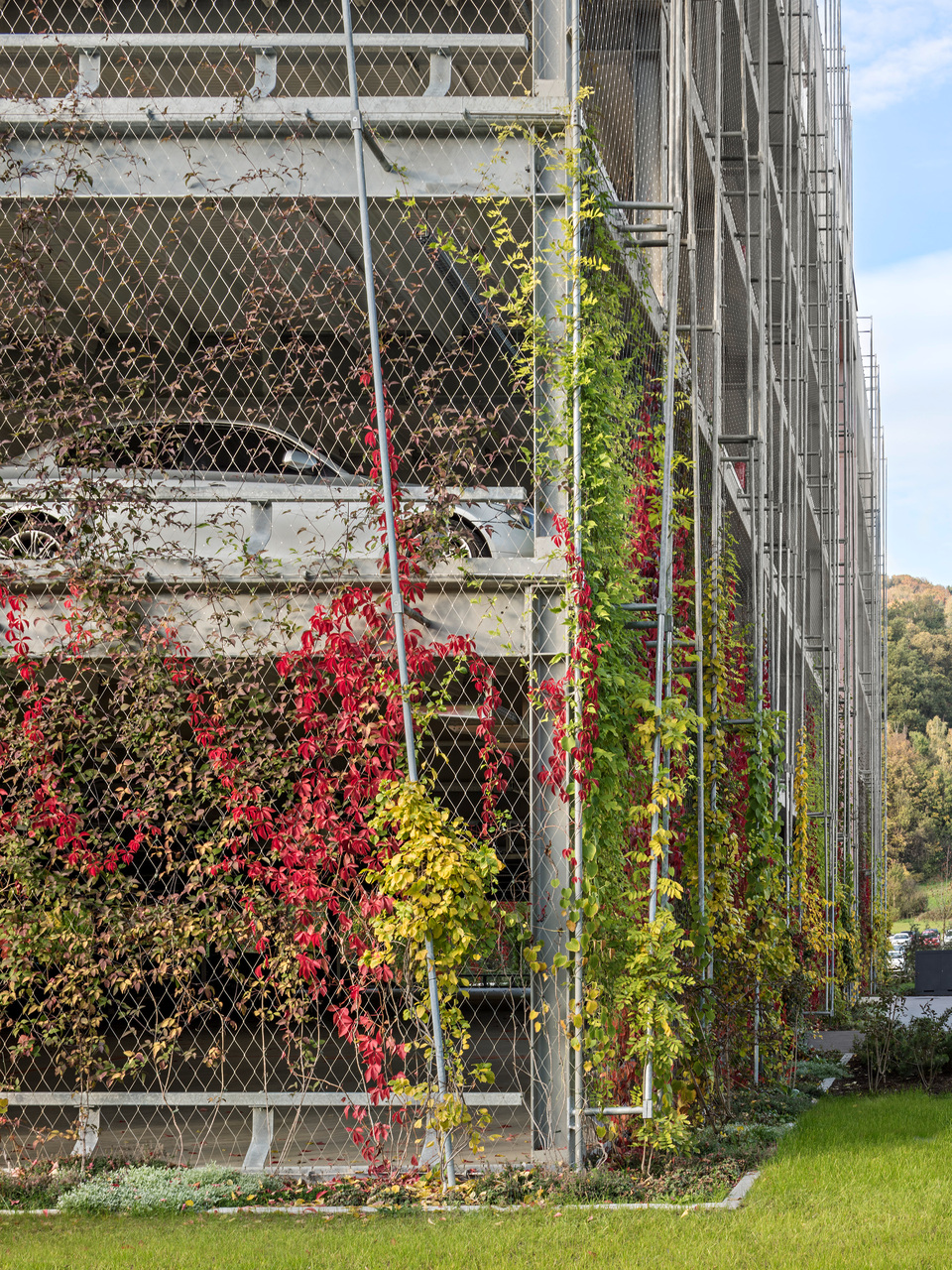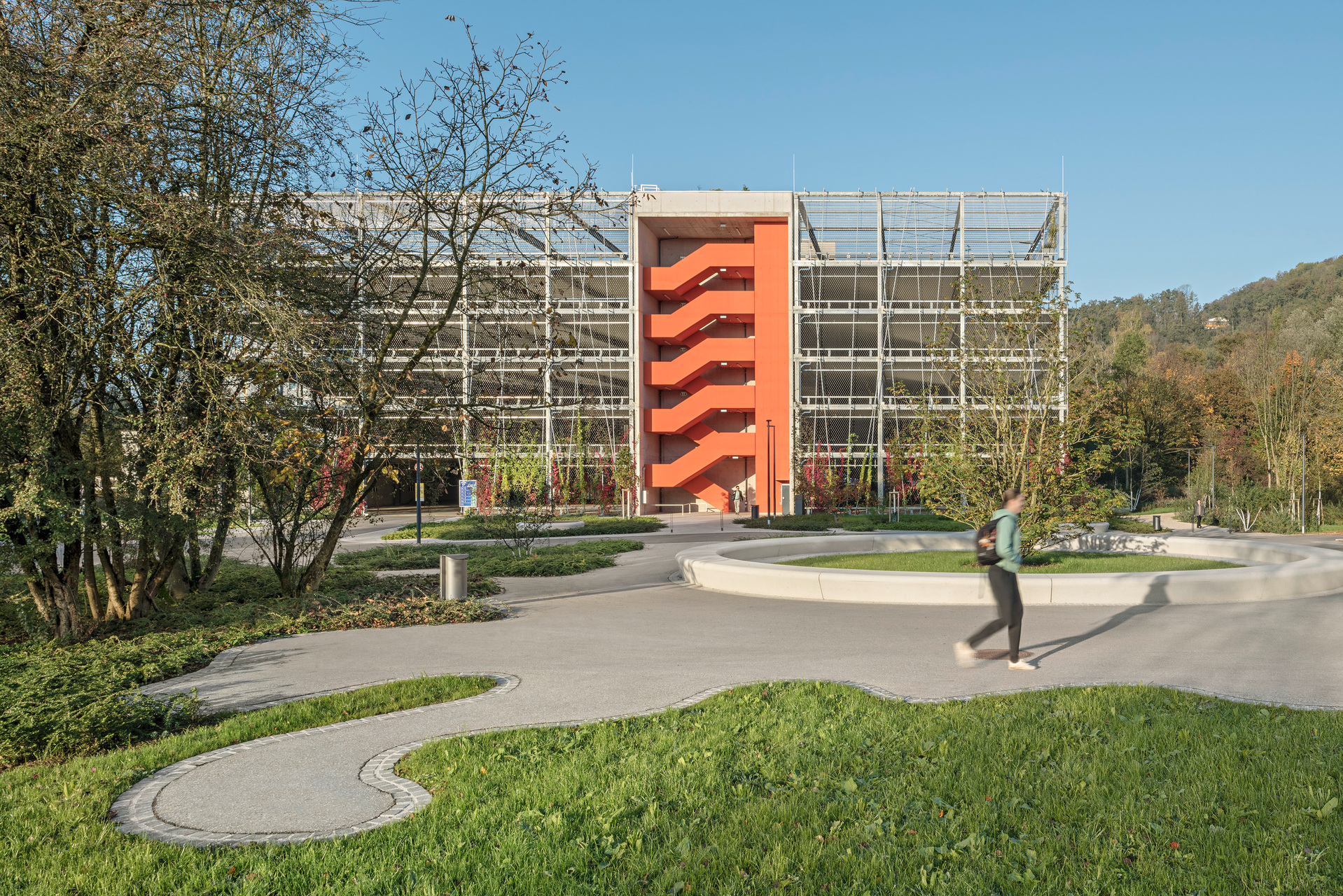 Die modulare Stahlskelettkonstruktion ermöglicht Flexibilität und Robustheit. Die offene, begrünte Fassade sorgt für natürliche Belüftung und fügt sich harmonisch in die umgebende Landschaft ein. Niederschlagswasser wird nachhaltig in Sickermulden und Bodenfilterbecken versickert, was auch die Anforderungen des Wasserschongebiets erfüllt.