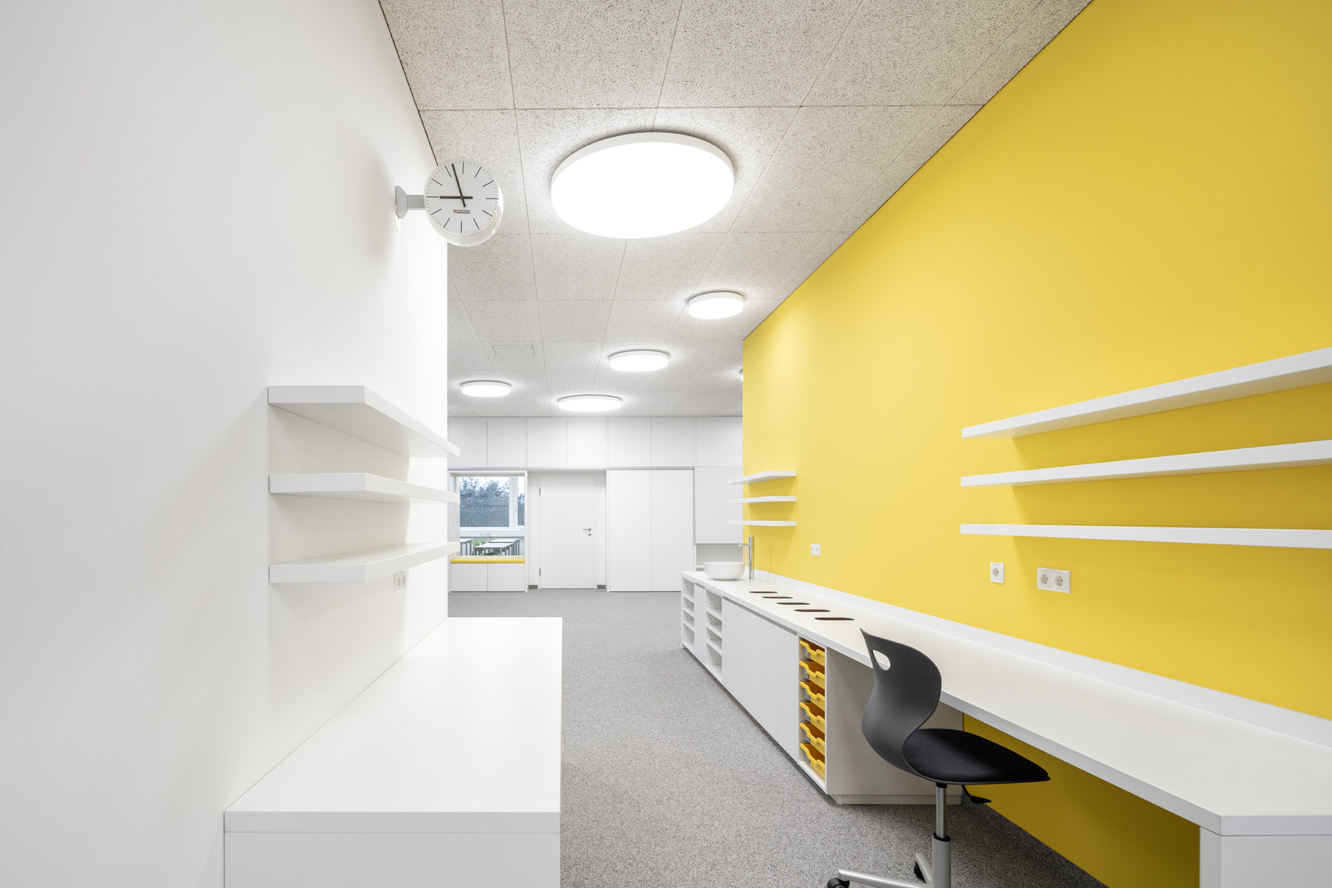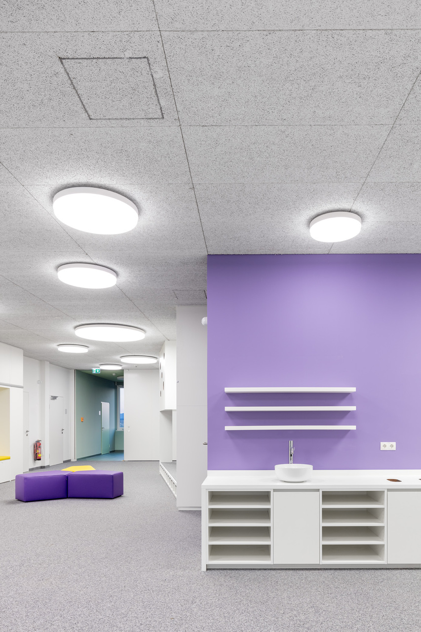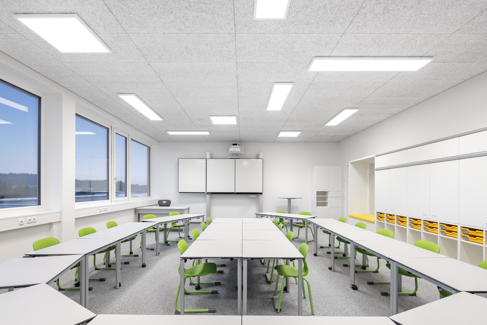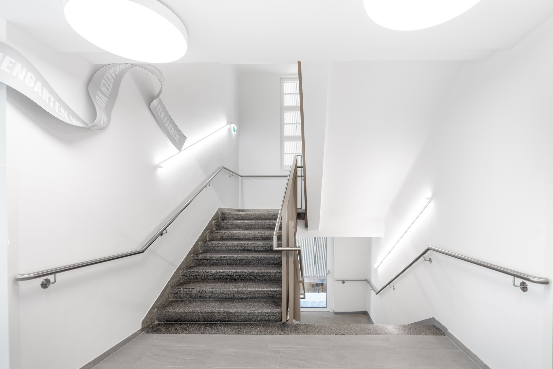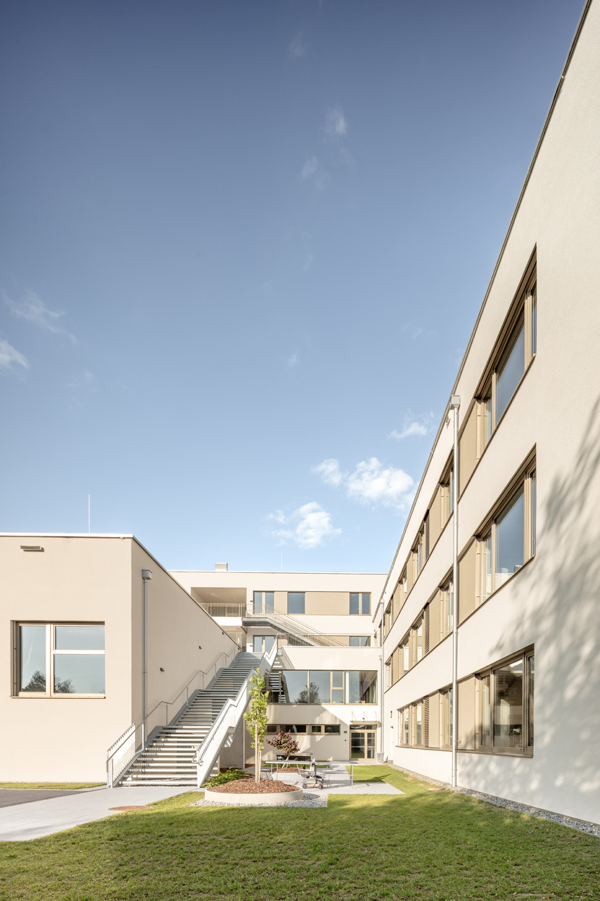 Ein befestigter Vorplatz führt von der Linzer Straße zum Eingang und damit direkt ins „Herz der Schule“, wobei die Auskragung des Obergeschosses Witterungsschutz für die Ankommenden bietet. Der Eingang ist in eine Wegachse eingebunden, die alle Schulteile von der Mittelschule bis zur Landesmusikschule miteinander verbindet. Garderobe und Verwaltungsbereich schließen unmittelbar an. Die Halle führt zu den Hauptstiegen von Mittel- und Volksschule. Im Erdgeschoss befinden sich außerdem Ausspeisung, Bibliothek und ein Bereich für Vorträge oder Ausstellungen. Terrassen stellen den Bezug zwischen Innen- und Außenraum her. Der Turnsaal mit Nebenräumen liegt im Untergeschoss und ist nach Westen orientiert. Fensteröffnungen zum Pausenraum im Erdgeschoss sorgen für Belichtung von zwei Seiten.