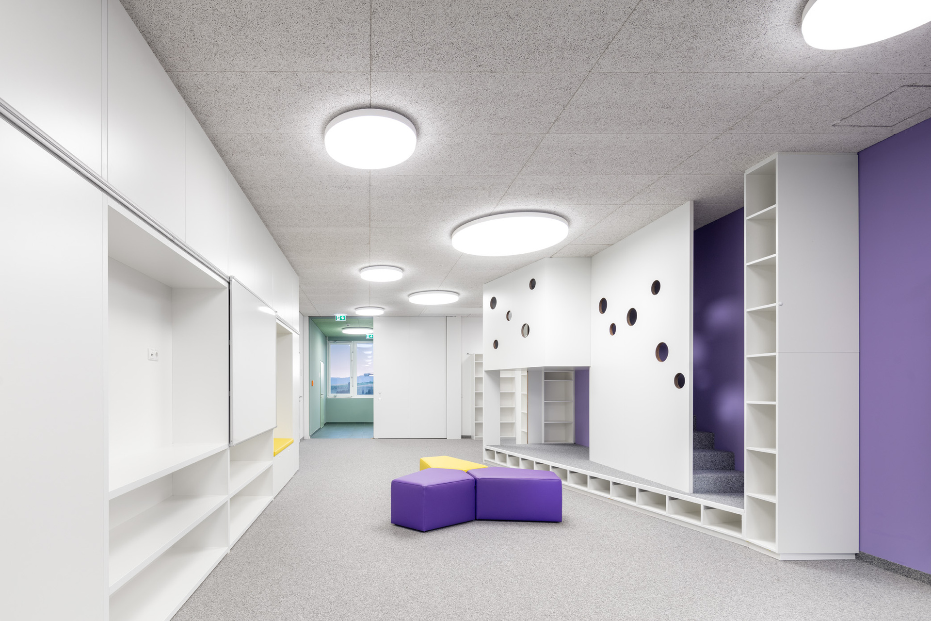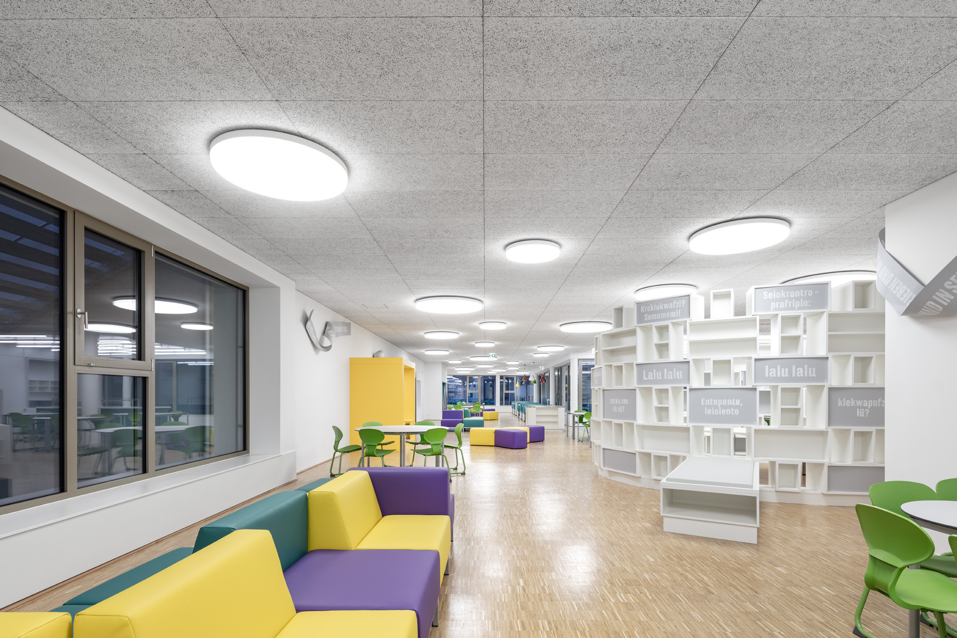 Das Schulzentrum Rohrbach-Berg ist eine „Marktplatzschule“. Offene Lerncluster mit jeweils drei bis vier Klassen gruppieren sich um einen zentralen Marktplatz, der unterschiedliche Lehr- und Lernsituationen ermöglicht. Auch der Unterricht im Freien ist durch zugeordnete Terrassen möglich. Das Kunst am Bau-Projekt „Sprachlandschaften“ besteht aus „Poesie-Bändern“ als Metapher des Weges durch eine Landschaft. In der Bibliothek markieren lyrische Silbenketten den Ausgangspunkt der Spruchbänder, die sich durch das gesamte Schulzentrum fortsetzen. (Text: Tobias Hagleitner, nach einem Text des Architekten)