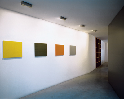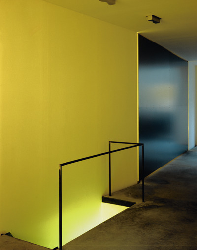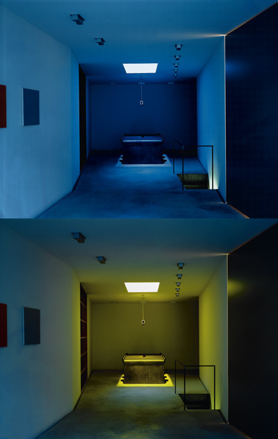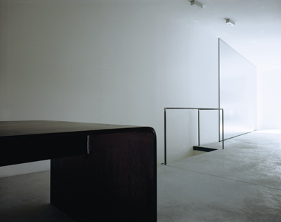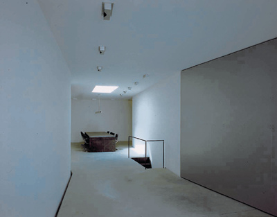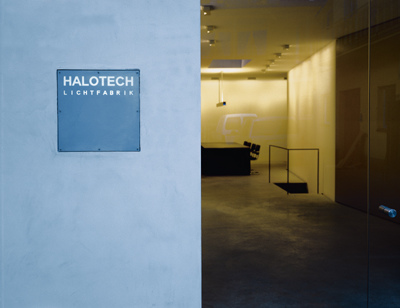 In der Mitte des Lokals bilden die schräg verlaufenden Wände eine Engstelle, von der aus sich der Raum in der einen Richtung zu Tür und Tageslicht, und in der anderen zum großen Tisch-Platz öffnet. Der monolithische Tisch besteht aus einer gebogenen Stahlplatte, deren Rundung das Spiel des Tageslichts reflektiert, das über das teilweise wiedergeöffnete Oberlicht in den hinteren Teil des Raumes fällt. Nachts taucht ein über dem Oberlicht im Freien montierter Disco-Strahler diesen Bereich in unterschiedliche Lichtfarben. Das einzige „Möbel“ neben Tisch und Stühlen ist ein Kirschholzregal, das - selbst ein Leuchtkörper - bündig in den Hohlraum der Wand eingelassen ist. Will man sich, etwa bei konzentrierten Besprechungen oder bei Leucht-Proben, gegen den Eingangsbereich abschirmen, kann man eine schwenkbare Aluwand öffnen und damit den Raum verdunkeln. (Text: Gabriele Kaiser 23.09.2001)