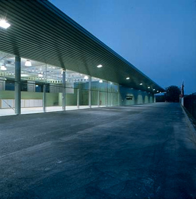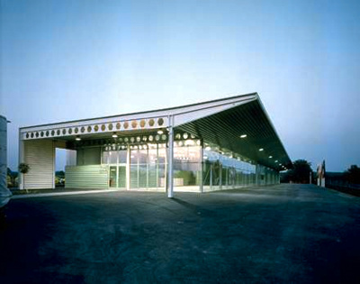 Einzelne Stahlrahmen aus Waben- und I-Trägern bilden die primäre Tragkonstruktion. Eine Hüllstruktur aus Trapezblechen umfasst die heterogenen funktionalen Bereiche. Im Ausstellungsbereich wurde die Trennung zwischen Innen und außen bewusst verwischt beziehungsweise abgeschwächt, indem diese Hüllstruktur einerseits als Vordachuntersicht weithin nach außen ragt, sich aber auch im Inneren des Ausstellungsraumes als Wandverkleidung weiterzieht. Innen und außen sind hier nur noch durch eine rahmenlose Verglasung getrennt.