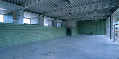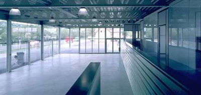 Über den Technik- und Sozialräumen liegen die Büros; als Kommunikationort zwischen internem Betrieb und den externen Angelegenheiten, gegenüber der Ausstellungshalle halbgeschoßig versetzt und sind räumlich in den offenen Bereich einbezogen.
