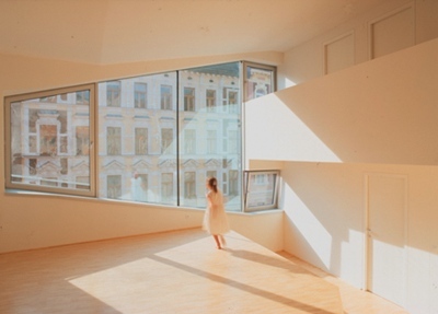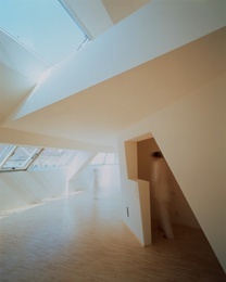 Die Kollektivräume der Hausgemeinschaft hingegen sind nicht als Nebenräume im Souterrain angelegt, sondern liegen vom Laubengang aus begehbar zentral im Gebäude auf zwei Ebenen, ineinander verschachtelt und teilweise mit Sichtverbindung untereinander: eine Küche mit Eßplatz, die für größere Einladungen oder Feste benutzt werden kann, die Waschküche, ein Raum für mögliches Teleworking und das erweiterte Wohnzimmer für alle, eine Bibliothek. Diese verfügt auf beiden Ebenen über einen Zugang, wobei sich der Raum bei Benutzung des unteren Eingangs über eine extrem steile, gewendelte Rampe erschließt, die seitens der Baubehörde nur deshalb genehmigt wurde, weil sie als „Bergskulptur“ (Benutzung auf eigene Gefahr) gewidmet wurde. Lediglich der Discoraum für die Jugendlichen ist im Keller untergebracht und auch separat von der Gasse aus zugänglich. Ins Hallenbad, in den Kindergarten oder ins Café spazieren die Mieter und Mieterinnen eine Gasse weiter in die „alte Sargfabrik“.