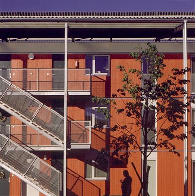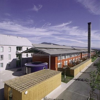 Zwei lange, parallel angeordnete Hallen bilden die Basis für die markante Bebauungsstruktur und formen durch gezieltes Abtragen und Erweitern der Baukörper eine differenzierte Struktur von Gassen, Höfen und Nischen, die von den Bewohnern mit viel Freude rasch angenommen wurde. In die bis auf die Tragstruktur abgetragenen Hallen wurden kompakte Baukörper eingeschoben. Unter dem schützenden Dach stapeln sich die vorgefertigten Holzkonstruktionen in Grosstafelbauweise. Der warme Charakter der Bauten wird durch die rote Farbgestaltung freundlich betont – vielleicht auch als geschichtlicher Brückenschlag, als Zeichen der Transformation von der Herstellung des Ziegels zur Errichtung der „Wohnfabrik“.