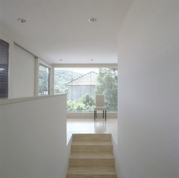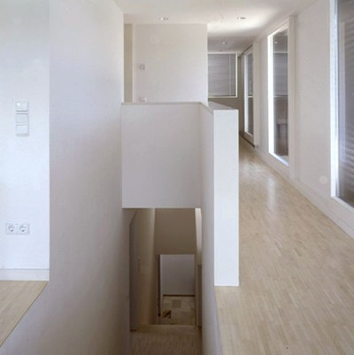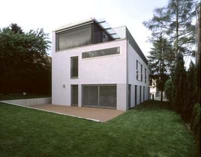 Der dreigeschossige Baukörper findet seine räumliche Entsprechung im 8,5 m hohen Luftraum und der „holländischen“ Treppe. So lässt sich das Haus auch innen, vom Vorraum, aus in allen Dimensionen erfassen. Die grosszügig ausgelegte Dachterrasse bewirkt eine Rückgewinnung des „verlorenen“ Aussenraumes.