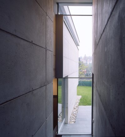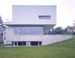 Die besonders spezielle Geometrie des Obergeschosses besteht nur aus einer einzigen Fläche, die sich von der Ostwand des Carports zu einer z-förmigen Deckenplatte entwickelt, als Nordwand des Bade- und Schlafbereichs in die Vertikale kippt und zur umhüllenden Decken-, Wand- und Bodenplatte des Kinderbereichs wird. Die konstruktive Eigenständigkeit und die zum Sockelgeschoß unterschiedliche Oberflächengestaltung verleihen dem weiß verputzten oberen Geschoß schwebenden, skulpturalen Charakter.