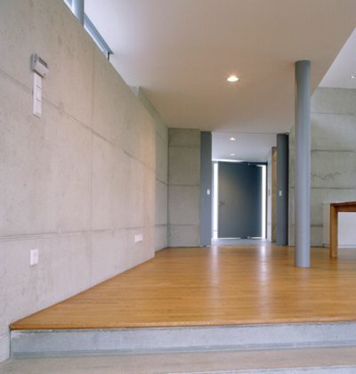 Das Gebäude besteht aus zwei voneinander unabhängigen Teilen, deren unterer als Sichtbetonsockel ausformuliert, die Bereiche des Ankommens, Kochens, Essens und Wohnens aufnimmt.