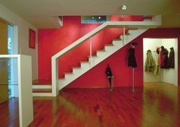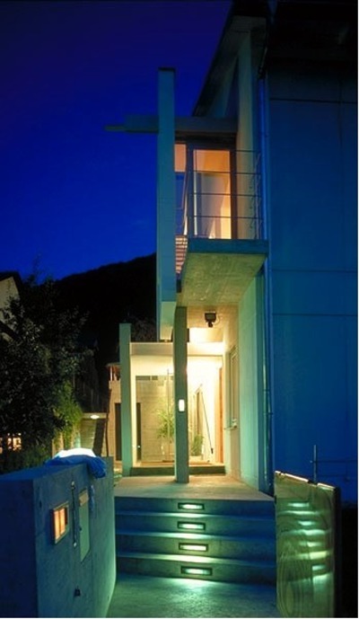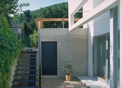 Die neu errichtete Stützmauer ermöglicht ein „Zimmer im Freien“; ein japanisch inspirierter, kleiner Innenhof, der dem neu geschaffenen Arbeitszimmer vorgelagert ist. Die Schatzkammer des Hausherren, der Weinkeller, wurde mit einer schweren Eisentür verschlossen. Mittels Knopfdruck vom Büro aus gleitet sie zur Seite und gibt den Weg in den Keller frei. Um den eigenen Ansprüchen gerecht zu werden, betätigten sich die Planer kurzerhand selbst als Handwerker: ein drei mal drei Meter grosses Massivholz wurde von den Architekten, per Motorsäge und Handschliff, kunstvoll zum Boomerang geformt, der fortan als Geländer dient.