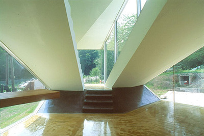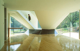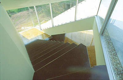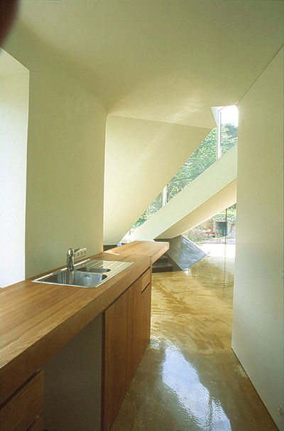 Die Locke nimmt das Niveau der bestehenden Bestandsdecke auf und führt sie ins Freie weiter. An der strassenseitigen Außenecke neigt sie sich zum Boden. Einerseits als statisches Auflager, andererseits zur Verbindung der Geschoße. In diese Schräge ist ein Loch eingeschnitten, durch das die Seiten der Scheibe gewechselt werden können. Nachdem sie den Boden berührt hat, steigt sie senkrecht nach oben und wird zur Wand, um dann wieder in die Neigung des bestehenden Dachs zu knicken und so die Überdeckung der Innenstiege zu bilden.