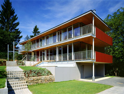 In sonniger Hanglage im Nordosten des Grazer Zentrums sind Offenheit und Freiraumbezug Pflicht, wenn man die Vorzüge des Ortes ausschöpfen will. Architekt Peter Eder platzierte das geräumige Haus mit Einliegerwohnung und Büro am nördlichen Grundstücksrand. Eine lange Zufahrt, der terrassierte Garten sowie ein Swimmingpool als Ausläufer des betonierten Kellergeschoßes bilden eine sorgfältig modellierte Landschaft im Vorfeld.