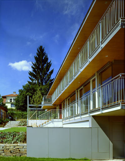 Abgeschlossen werden die Terrassen von einem Stahlgeländer mit vertikalen, teils leicht schräg gestellten Stäben. Die Choreographie dieses leicht bewegten Brüstungsmotivs blieb dem ausführenden Schlosser überlassen. Er hatte die Wahl, in welches der vier vorgesehenen Bohrlöcher pro Stab er die Stahlstangen einspannt. Ohne großen Aufwand gelang damit, ein luftig wirkendes, einzigartiges Geländer, das im Gegensatz zu den sonst sehr beliebten horizontal gespannten Stahlseilen auch den Sicherheitsvorschriften in der Bauordnung entspricht.