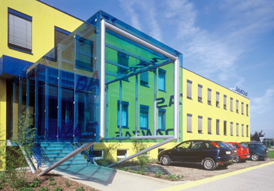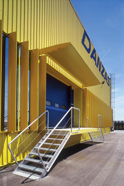 Ein beherzter Griff in den Farbtopf schuf Abhilfe gegen das ursprüngliche Grau in Grau der Anlage und prägte die Corporate Identity der Firma mit signalhafter Blau-Gelb-Komplementarität völlig neu. Gelb als Grundfarbe in Wand und Decken, Blau als Akzentfarbe etwa in der verglasten Eingangszone, im Innenbereich der Fahrerzuweisung sowie in der grossflächigen stirnseitigen Hallenverglasung verleihen dem Industriebau sein neues, weithin sichtbares Erscheinungsbild.