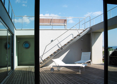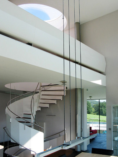 Inside, the principle of layering is omnipresent as well: arranged around the atrium courtyard at the bottom are the entry area, a garage and an adjacent party room with a gym and a sauna; in the middle are the open living and work areas with a flowing transition to the extensive terraces and the pool; the nest at the top accommodates the private areas for retreat. Access to all areas is by a centrally positioned spiral steel staircase, which connects all levels of the house. (Nach einem Text der Architekten)