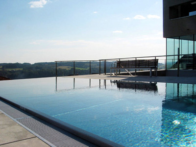 Between the presence of these two solid bodies – the pedestal and the cube – a space opens up, defined by a wrap-around glass façade. Three individual walls, barely visible from the outside, support the weight of the cube. This vertical arrangement of massive and transparent building parts is a defining element of the design and accounts for the building’s elegant dimensions as well as its palpable connection to the surrounding landscape.