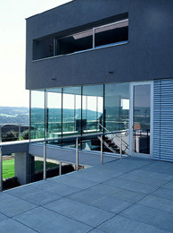 The first story is the pedestal, which is recessed into the hill and becomes part of it: the terrain breaks open along a contour line and is continued in the form of a terraced lawn above it. The base is supported by a rock wall to the south, towards the hill. Two floors above it hovers the „nest,“ a closed cube with a smaller floor space and just a few window openings for good views into the valley.