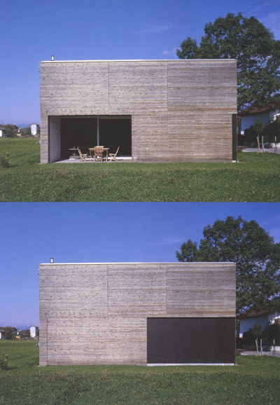 Dem offenen Raumkonzept liegt die Idee einer inneren Erweiterbarkeit zugrunde. Durch den späteren möglichen Ausbau der Galerie und des Luftraumes kann im derzeit für zwei Personen entworfenen Haus bei Bedarf zusätzlicher Raum geschaffen werden. Das kubische Erscheinungsbild des Gebäudes ist einerseits Ausdruck dieses inneren Konzeptes, zum anderen stellt es die Reaktion auf die gewerblich genutzte Umgebung dar. Dabei akzentuiert der horizontale Fassadenrost aus Lärchenholz die Lage des Gebäudes im Spannungsfeld zwischen Wohn- und Gewerbegebiet.