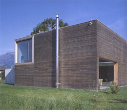 Auf einer massiven Bodenplatte wurde das Haus als Holzkonstruktion mit vorgefertigten Wandelementen errichtet. Decken und Dach wurden vor Ort gefertigt. Sämtliche Umfassungsbauteile sind hinterlüftet und mit Zellulose und Schafwolle gedämmt. Durch die sehr guten Wärmedämmwerte der Außenfassaden, einer Dreifachverglasung sowie einer kontrollierten Be- und Entlüftung konnte der Energiebedarf auf ein Minimum reduziert werden. (07.05.2001)