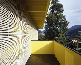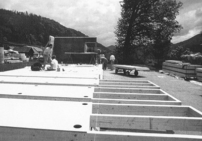 Fassadenhaut aus gelben Schichtholzplatten, vor UV-Bestrahlung und Schlagregen geschützt durch vorgesetzte Schattenmatten aus Holzlamellen, je nach Wetterseite gefärbt, berankbar. Variable Schrankwände, große Dachvorsprünge, keine Rinnen. Halb so teuer wie gängige Fertighäuser. (Text: Otto Kapfinger, 21.09.2000)