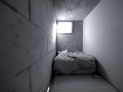An der Sichtbetonwand die einläufige Treppe in der dreiseitig belichteten Küche hoch, darüber auskragende, große Schlafraum schenkt ihr eine gedeckte Terrasse vor dem malerischen „Schattengarten“, fünf Fenstertüren schaffen viele Freiraumbezüge sowie enorme Zugangsvielfalt. Die obere Ebene ist Meter hoch, was auf kleinster Fläche ungeahnte räumliche Großzügigkeit erzeugt. Mit Panoramarundblick durch die diagonalen, haushohen Lichtlufträume gewinnt der teils zweigeschossige Wohnraum am Südgarten mehrdimensionale Panoramaweite, sich darüber in dialogischer Vogelperspektive nach innen außen fortsetzt.