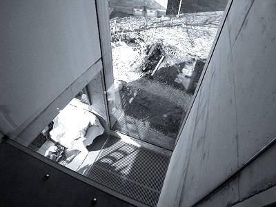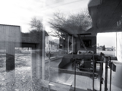 Gelassen schafft der Parkplatz dem fast vier Meter hohen Atelier Öffentlichkeit, die geringe Höhe lässt Nachbarn den Gebirgsblick. Straßen- und Gartenseite sind gleich: sofort ist die über drei Meter hohe Doppelglastür als wichtigste Öffnung erkennbar, ein großes Fenster schenkt Licht und inspirativen Blickkontakt Straße und Haus. Der alle Scheinwerfer und das Equipment bergende Raum lässt sich komplett verfinstern, kann Dunkelkammer oder transparentes Studio sein. Hinter dem kleinsten Fenster liegt das „Extrazimmer“ mit Sanitärzelle, Schlafpodest und eigener Tür im Westen.