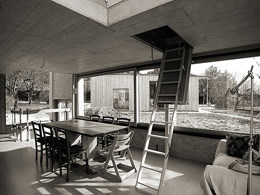Zum Atelier verschränkt, exakt nord-südorientiert rahmt das zweigeschossige, unterkellerte Wohnhaus einen privaten „Sonnengarten“, der in Großvaters Grund überfließt. Die kleine Tochter sieht durch die Luftraumsäule ihres Zimmers auf Großvaters Sitzbank, über eine ausklappbare Dachbodentreppe kann sie über den Wohnraum ins Freie laufen. Das Haus ist ein Mischbau, die tragende Sichtbetonscheibe teilt es Nord- und Südseite. Über eine im Rasen versenkte Cortenstahltreppe betritt man den Keller am Zwischenpodest unterm südöstlichen Luftraumeck, Oberlicht und die zweite Lichtsäule wandeln ihn zum hellen Wohnraum.