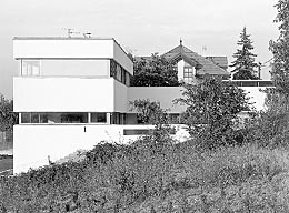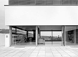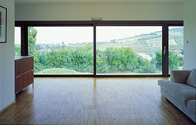 Orthogonal auf diesen Haupttrakt liegt ein niedrigerer Schenkel, der, teilweise mit einer Dachterrasse versehen, bis zur Straße reicht und in dem der Unterschied zwischen höherem Straßenniveau und tiefer liegender Wohnebene über die hinabführende Eingangstreppe ausgeglichen wird. Das räumlich Besondere ist nun, daß zwischen den beiden Baukörpern und einer den Hang abfangenden Stützmauer an der Südseite ein (auch sicht-) geschützter Hof ausgebildet wird, der eine Orientierung zur Sonne praktisch in jeder Ecke des Erdgeschoßes möglich macht: Über große Glasschiebeelemente kann dieses Semiatrium westseitig Diele und Küche und südseitig dem Wohnzimmer als ergänzender Außenraum zugeschaltet werden. Betritt man den Wohnraum, eröffnet sich dem Betrachter erst die volle Qualität der architektonischen Konzeption: Auch die Nordseite ist auf 15 Metern Länge ganzflächig verglast und gibt den Blick auf das Weinbergpanorama frei, über die Kuppeln des Stiftes Klosterneuburg hinweg bis zur Burg Kreuzenstein ganz in der Ferne.