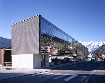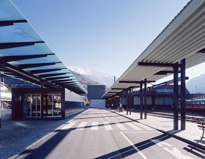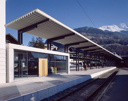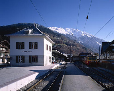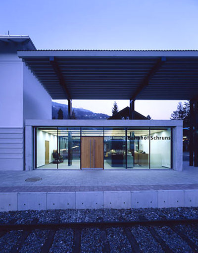 Das alte, für das Ortbild von Schruns sehr prägende Bahnhofsgebäude wurde behutsam renoviert, ein ostseitig daran anschließender erdgeschossiger Anbau aus den 1930er Jahren wurde jedoch abgetragen und durch einen neuen transparenten Baukörper für Fahrdienstleitung und Warteraum ersetzt. Das schmale, Richtung Ortszentrum vollflächig verglaste Büro- und Geschäftshaus der Montafoner AG gibt dem Areal gemeinsam mit dem bestehenden Remisengebäude dahinter eine längsorientierte räumliche Fassung. Die Tiefgarage mit rund 170 Stellplätzen, die teilweise dem Silvretta Center zugehören, liegt direkt unter der Bahnhofstrasse und gliedert sich im Einfahrtsbereich in einen eingeschossigen und unterhalb der Remise in einen zweigeschossigen Bereich. Unter dem Flugdach der Verkehrsinsel befindet sich der neue, in einer hochgedämmten Leichtkonstruktion errichtete Kiosk. (Text: Gabriele Kaiser, 10.01.2002)