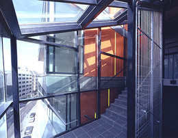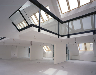 Man ahnt bereits, daß ein derart zugleich in der Horizontalen wie in der Vertikalen differenziertes Konzept konstruktiv nicht ganz einfach zu bewältigen ist, schon gar nicht zu den Kosten eines konventionellen Bürohauses. Daß Driendl hier erfolgreich war, ist eine Meisterleistung, auch wenn er Abstriche bei manchen Materialien und Details - etwa beim Verzicht auf die Verglasung des Aufzugs - in Kauf nehmen mußte.