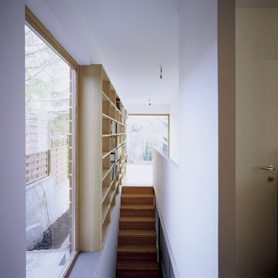 Parallel zur Außentreppe führt ebenfalls entlang der Ostwand innen platzsparend eine einläufige Holztreppe in das Obergeschoß. Sie mündet in einem galerieartigen Leseplatz, der ebenso wie die Treppe viel Licht durch ein raumhohes, um die Gebäudeecke gezogenes Fenster erhält. Die Bibliothek fand praktischerweise gleich in einer Regalwand, die die Treppe begleitet, Platz.