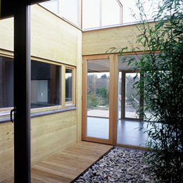 Möglich ist all das durch einen Innenhof, der von einer Stützmauer im Westen begrenzt wird. Das Wohnzimmer und das im rückwärtigen Teil des Hauses gelegene Arbeitszimmer sind zum mit Bambus und Kies fernöstlich inspirierten Patio hin verglast. Die Küche öffnet sich mit einem horizontalen Fensterband. Diese Lösung mit Innenhof gewährleistet, dass auch die in der Mitte des Gebäudes bzw. teilweise im Hang liegenden Bereiche des Hauses nicht nur ausreichend Licht erhalten, sondern durch das Weiterfließen des Raumes nach außen die Räume größer wirken, als sie tatsächlich sind.