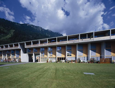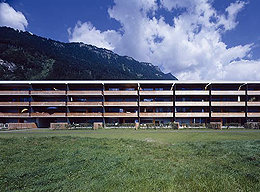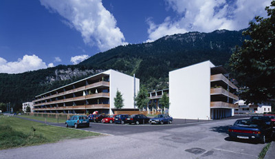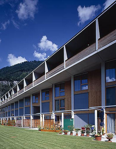 Der in nordöstlicher Richtung entlang der Strasse verlaufende Baukörper ist xylophonartig in einzelne grundrissgleiche Wohneinheiten aufgegliedert, die man mit ihren Vorgärten und dem auskragenden Loggiageschoss als eine grosszügige, die Privatsphäre respektierende Sequenz von Reihenhäusern bezeichnen könnte. Die insgesamt 87, teilweise als Maisonetten ausgeführten Wohneinheiten (die Grössen variieren zwischen 52 und 97 m²) sind zu einem individualistisch-gemeinschaftlichen Gefüge verdichtet, das nicht zuletzt durch den Grünkeil in der Mitte ihren Bewohnern jenen Mehrwert bietet, den man viel zu bescheiden als die „Luft zum Atmen“ bezeichnet. (Text: Gabriele Kaiser, 08.03.2002)