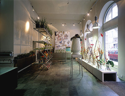 Die Geschäftsidee umfaßt neben dem Blumenverkauf und der Designobjektentwicklung für Blumen auch einschlägiges Consulting für die Raum- und Gartengestaltung. Die überraschende Begriffskombination aus Blume und Kraft tritt in moderner Kleinschreibung und in Otl Aichers kultig-strenger Schrifttype Rotis selbstbewußt und technisch-nüchtern auf. Der Ver- kaufsraum bestätigt die Namengebung und den graphischen Auftritt nicht nur, er übertrifft ihn, konterkariert ihn aber auch durch die dosierten Sinnlichkeiten in sachlichem Ambiente. Das hohe Erdgeschoßlokal in einem spätgründerzeitlichen Zinshaus ist seit der Eröffnung Ende 1999 ein trendbildendes Ereignis, tatsächlich einmal ein Erlebnis, das dem ursprünglichen Sinn des Wortes nahekommt - nicht nur für Floristen, sondern für jeden, der von der Schönheit der Pflanzen, von ihrer Wechselwirkung mit Raum und Material berührt wird.
