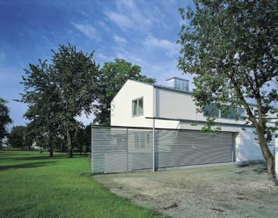 Flankiert wird das Wohnhaus von einem niedrigen verputzten Garagengebäude. Zu den Feldern hin begrenzt das Badehaus mit vorgelagertem Swimmingpool das Ensemble. Ein bestehender holzverkleideter Schuppen im Süden des Wohnhauses ist ein weiterer Mitspieler in diesem Ensemble. Um räumliche Anbindungen herzustellen, Grenzen zu ziehen und Bezüge anzudeuten, greifen Mauern bzw. nach Osten eine Wand aus Metalllamellen in den Gartenraum aus. Dadurch werden Höfe ausgebildet und der Außenraum wird in wohnliche Plätze gegliedert, die, bei aller Weitläufigkeit und Offenheit zum Umfeld hin, Geborgenheit und Sichtschutz bieten.