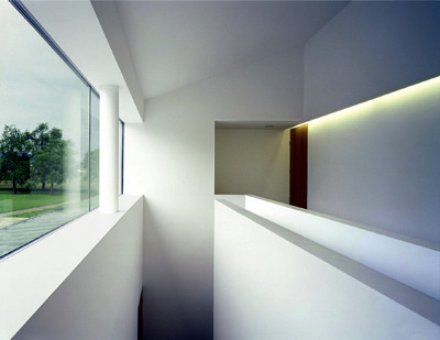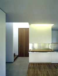 Das Innere ist nicht nur großzügig und praktisch auf die Bedürfnisse eines großen Haushaltes abgestimmt, sondern auch ein Musterbeispiel an kunstvoller Tektonik bis ins kleinste Detail. In einer handwerklichen Präzision und Sorgfalt wie man sie selten findet sind Fenster- und Türrahmen, Schränke und Deckenleuchten oder auch die Kaminnische im Wohnzimmer fein säuberlich in die undekorierten weißen Wände eingefügt. Grundsätzlich handelt es sich um eine konventionelle Abfolge von konventionellen Wohnfunktionen. Im Gesamten wirkt das Wohnhaus aber als ein komplexes Gefüge von Scheiben, Ebenen und Durchbrüchen. Ebenso raumbildend ist das Tageslicht, das sich von zwei Lichtkaminen am First in die Tiefe ergießt.