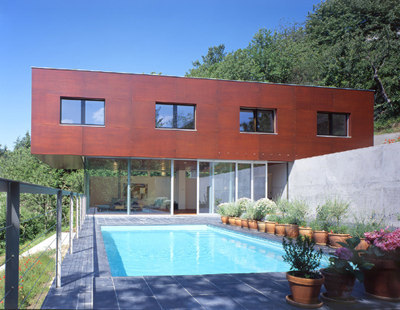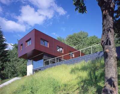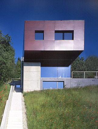 Der manchmal etwas mühevolle Anstieg versteht sich als Teil des Gestaltungskonzeptes, das sich die Topographie zunutze macht und das Wohnen mit dem Hang und der Aussicht zu einem täglichen Erlebnis werden lässt. (Nach einem Text der Architektin, 16.05.2002)