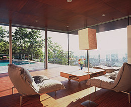 Die Individualräume sind in einer holzvertäfelten Box zusammengefasst, die auf 4 Säulen über dem weitgehend entmaterialisierten Erdgeschoss zu schweben scheint. Eine Verkleidung aus kastanienbraunen Sperrholztafeln umhüllt aussen die Box sowie die Deckenuntersicht im Wohnraum.