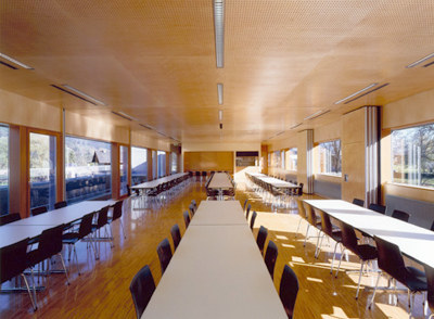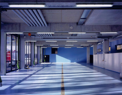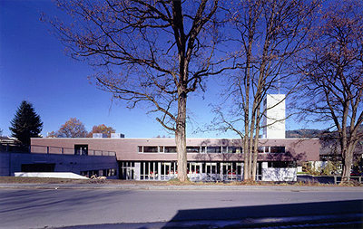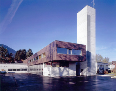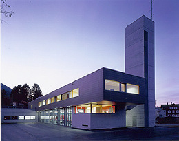 Der entlang der nördlichen Grundgrenze geführte Hauptbaukörper aus Sichtbeton (mit den Funktionen Vorfahrt, Halle, Kommando, Service und Lager) und der parallel zum Hang gesetzte und talseitig auskragende Nebentrakt (mit den Funktionen Parkierung, Verwaltung und Schulung) umschließen einen konischen Platz, der für Passanten von oben einsehbar ist und somit das Gebäude als örtliches „Allgemeingut“ definiert. Der ebenfalls in Sichtbeton ausgeführte Schlauchturm bildet ostseitig den signalhaften Schlusspunkt der abgewinkelten Figur. (Text: Gabriele Kaiser, 21.06.2002)