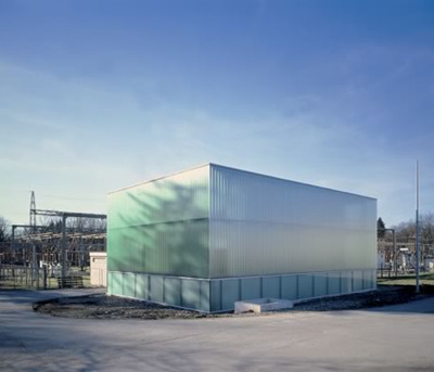 Die transluzente Fassade aus Profilglas über einem umlaufenden Mattglassockel (der den halbversenkten Raum im Untergeschoss belichtet) verleiht dem technoiden Innenleben des Bauwerks eine geometrisch präzise Fassung, die im Wechsel des Tageslichts grünlich, blassblau oder grau schimmert. Das Thema „Energie“ findet in diesem changierenden Lichtspiel einen unmittelbaren, unprätenziösen Ausdruck.