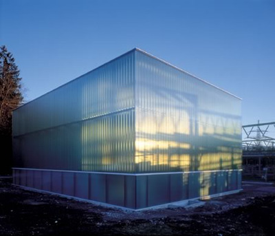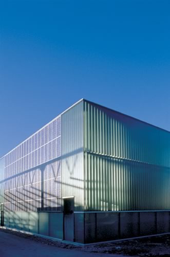 Die 7 Meter hohen Glaswände werden auf halber Höhe gegen die Windkräfte statisch gehalten, die Südfassade ist als grosse Fotovoltaikanlage ausgeführt, der innenräumliche Ablauf folgt ohne gestalterischen Umschweife rein technisch-organisatorischen Gesichtspunkten. (Text: Gabriele Kaiser, 07.06.2002)